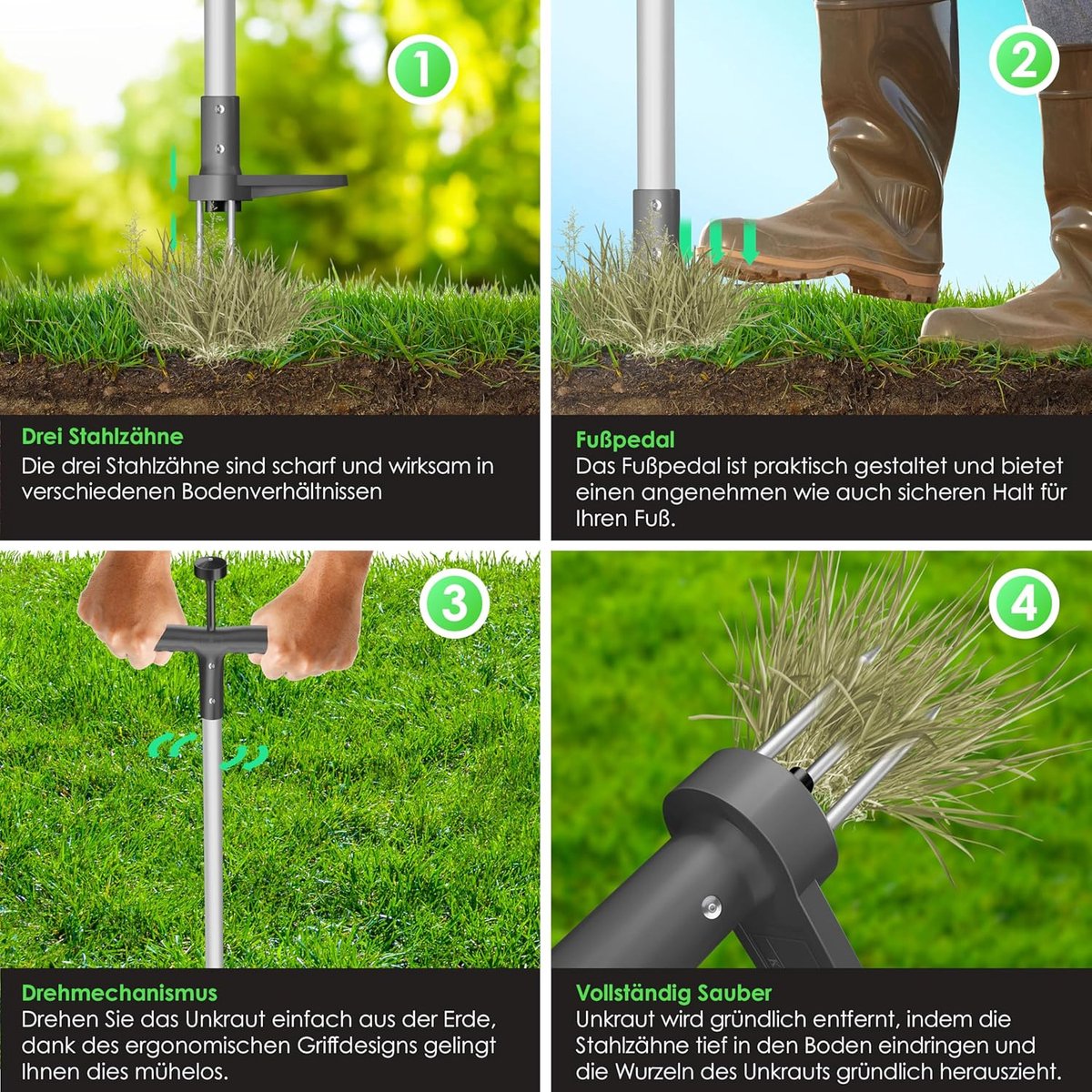 Veelzijdige toepassing: deze onkruidtrekker is zeer veelzijdig en geschikt voor verschillende soorten onkruid. Dankzij zijn flexibiliteit kun je onkruid in verschillende bodemomstandigheden effectief verwijderen, zonder daarbij gebruik te hoeven maken van chemische middelen. Of het nu op harde kleigrond of losse zandbodems is, deze onkruidverwijderaar kan elke uitdaging aan.