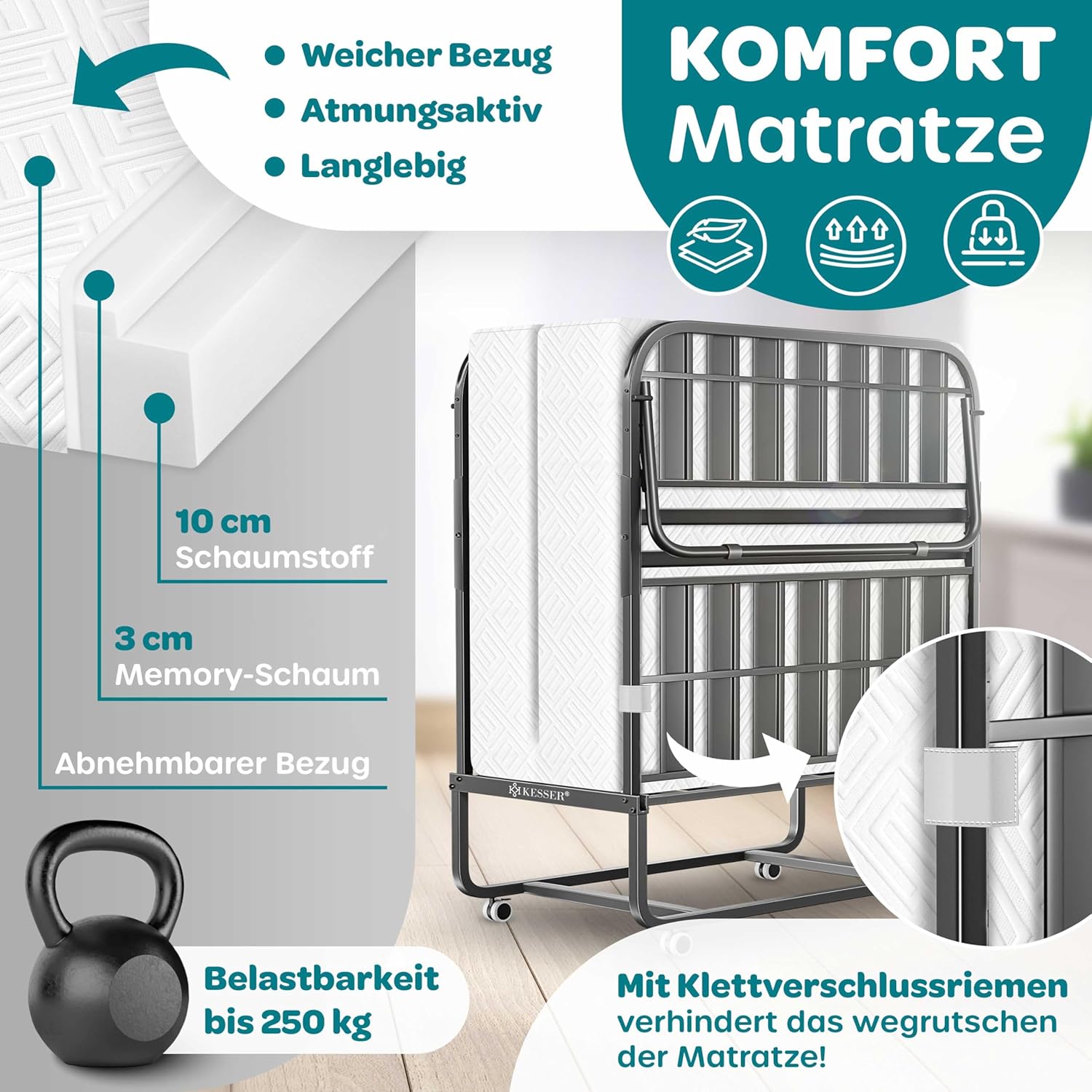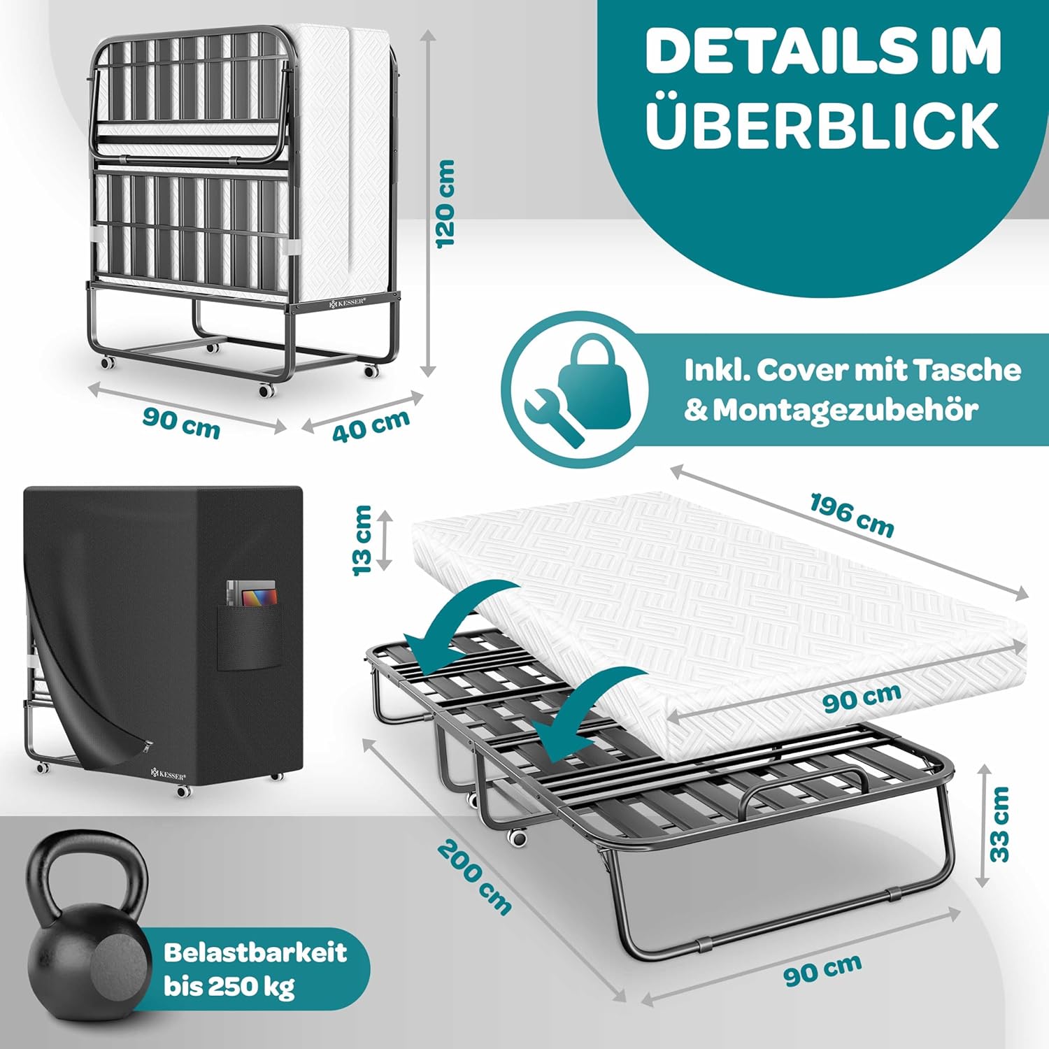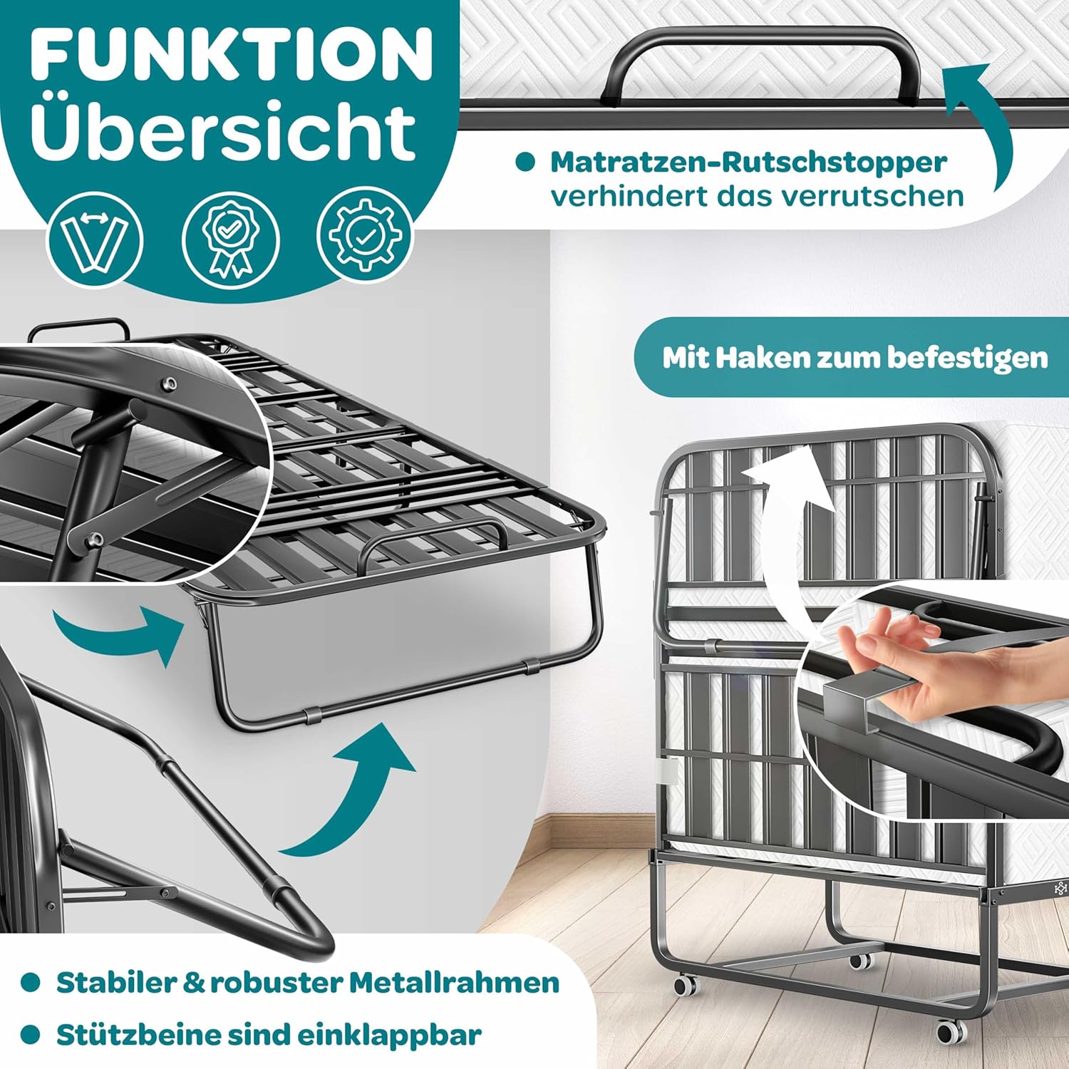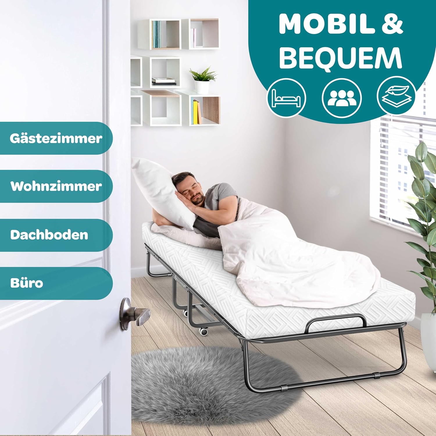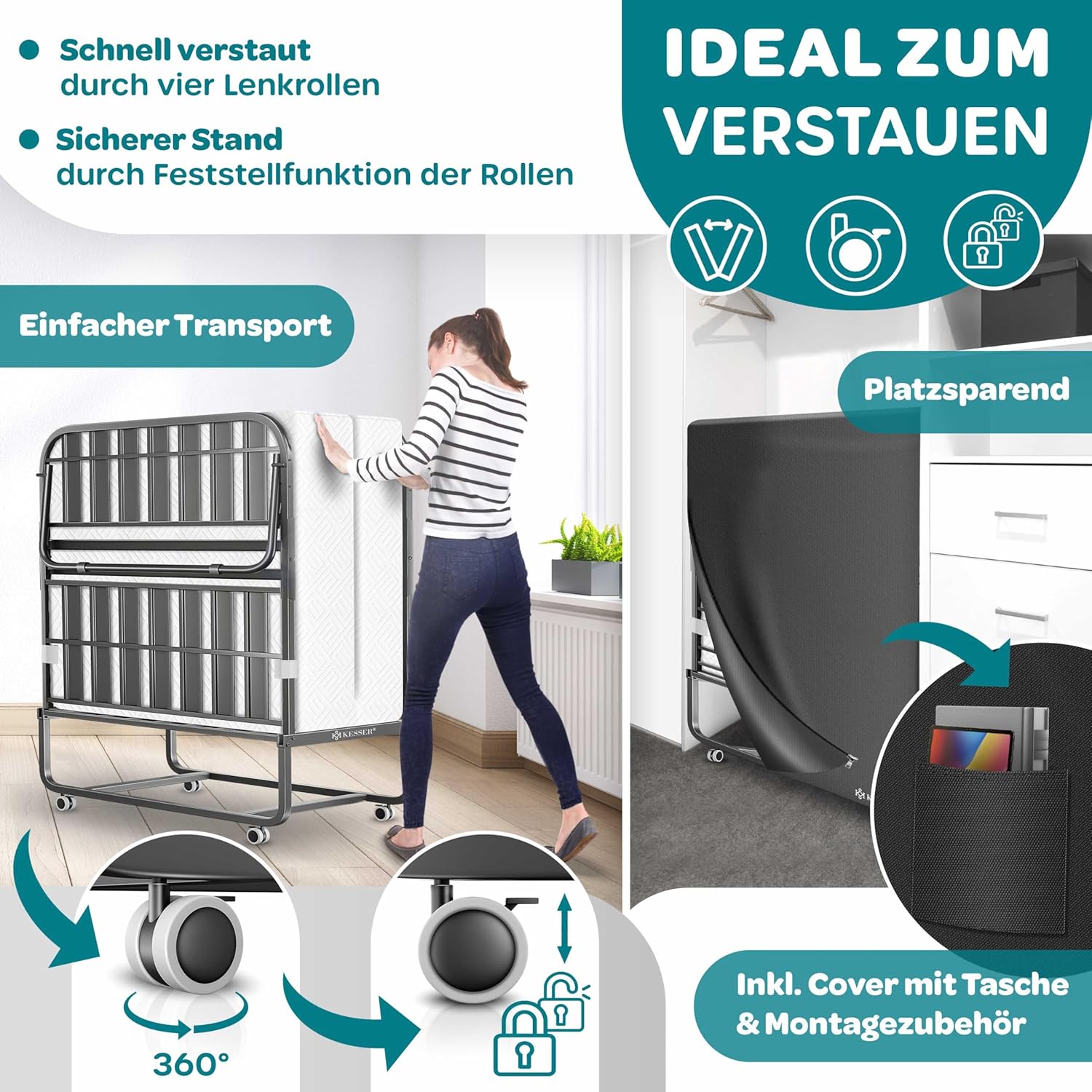 Snelle montage: dankzij de vier zwenkwielen met vergrendelingsfunctie kan het bed snel en eenvoudig worden vervoerd en veilig worden opgeborgen. Dit is bijzonder praktisch als je het bed vaak moet verplaatsen of opbergen. Ideaal voor logeerkamer, woonkamer, zolder of kantoor.