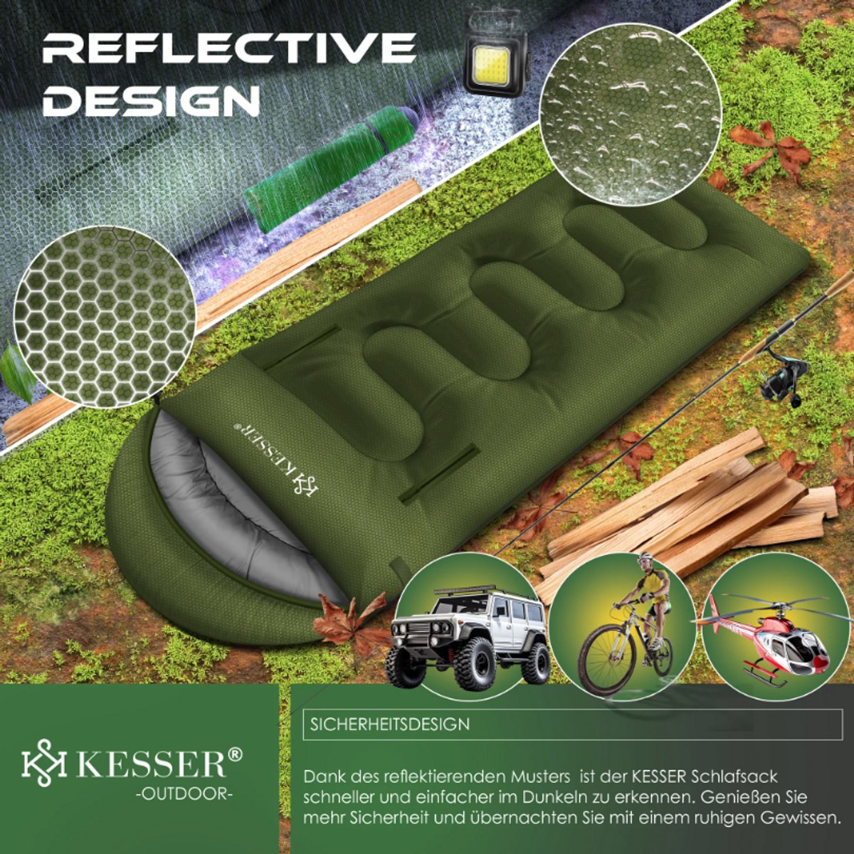 De KESSER slaapzak combineert waterdichte technologie, de mogelijkheid om een ​​dubbele slaapzak te gebruiken, een speciaal ontwerp, duurzaam materiaal, lichtgewicht, machinewasbaar, veelzijdig gebruik, vochtbescherming en hypoallergene eigenschappen voor ultiem comfort binnen en buiten.
