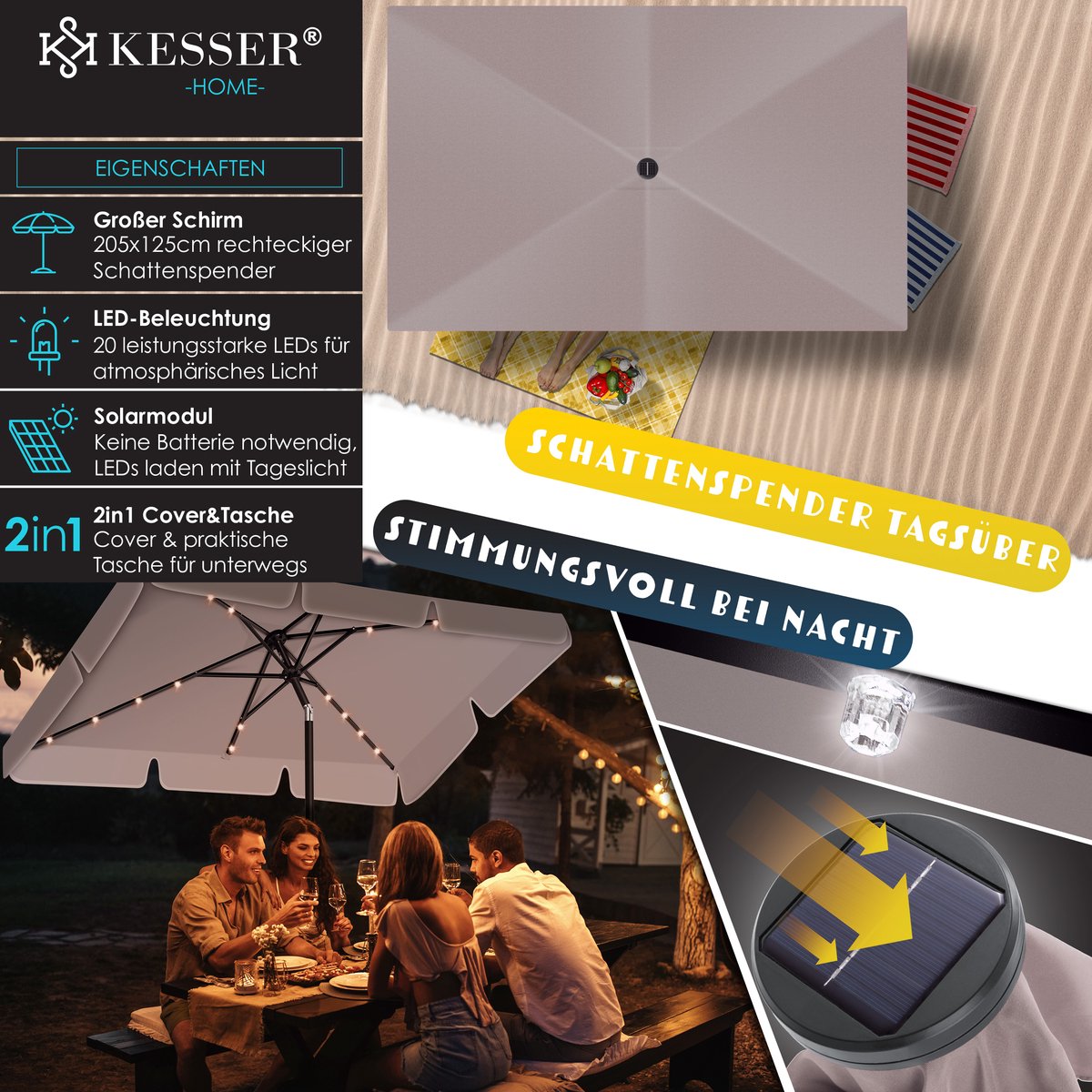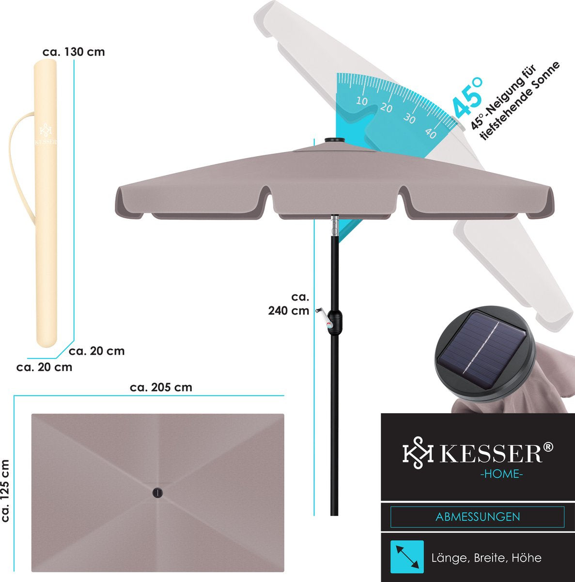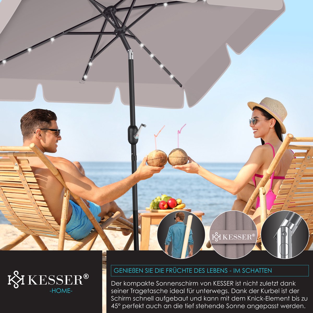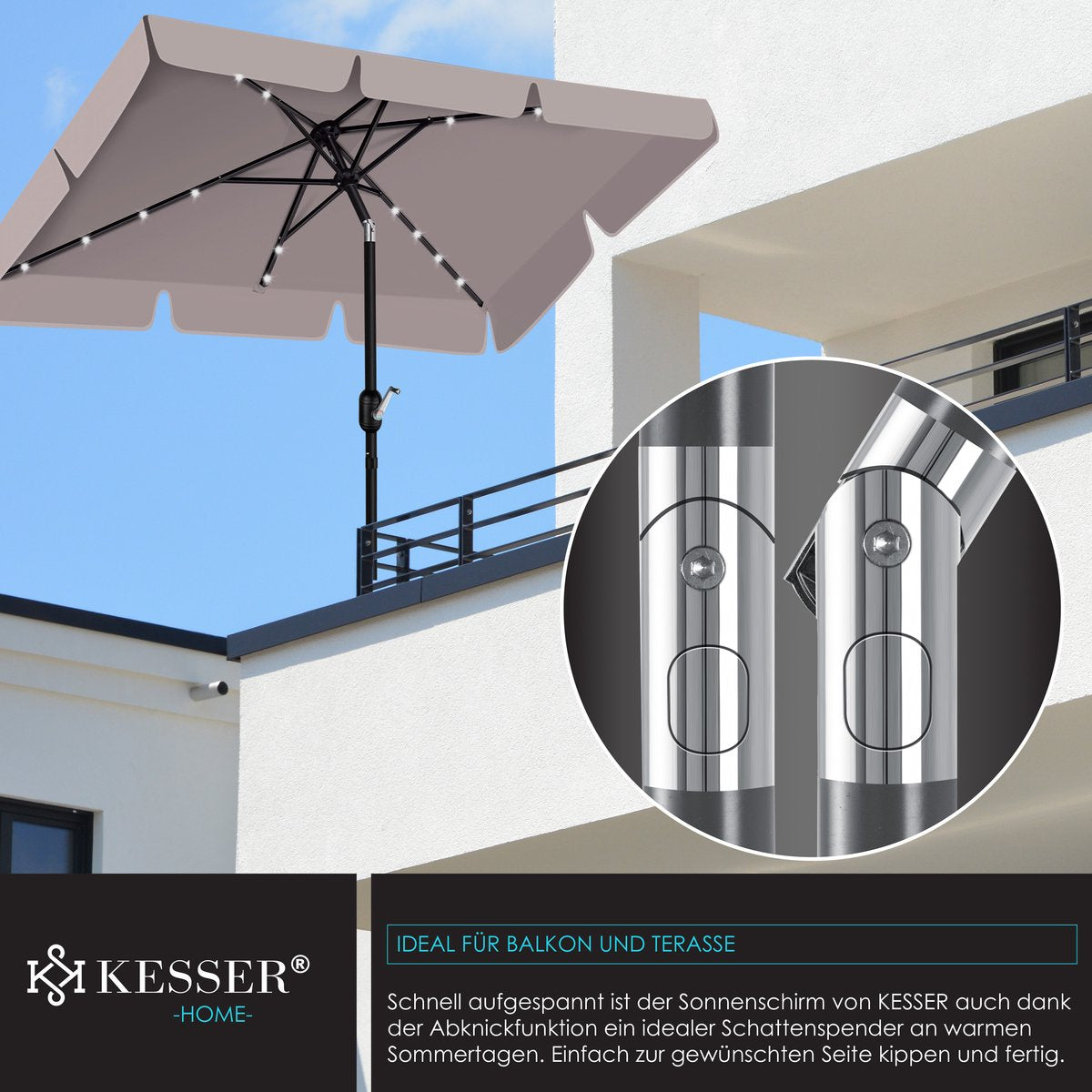 KESSER Parasol LED met geïntegreerde knikverbinding voor ideale schaduw, stevige roestvrijstalen en robuuste steunen, water- en UV-bescherming, opladen met daglicht dankzij geïntegreerd zonnepaneel, incl. 2in1 hoes & tas.
