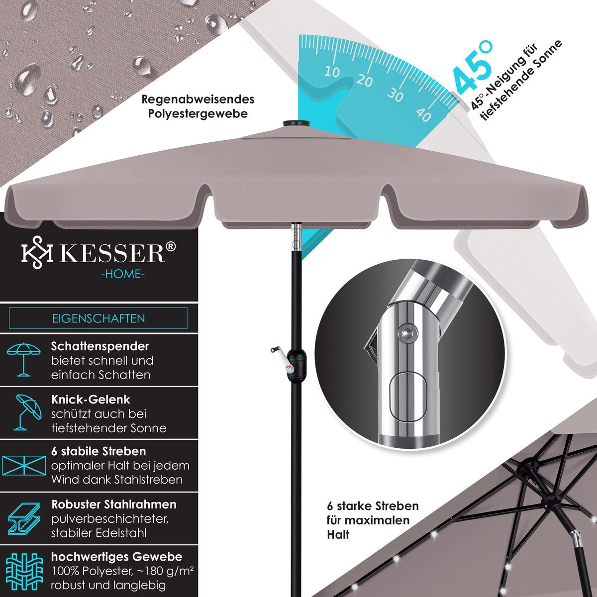 De stevige stokjes met een diameter van 4 cm zorgen voor een uitstekende stabiliteit van de balkonparaplu en maken hem windbestendig. Het frame is gemaakt van gepoedercoat staal, wat bijzonder robuust en duurzaam is. De hoogwaardige stof van 100% polyester met een gewicht van ~180g/m² is waterafstotend en is zelfs bestand tegen een lichte regenbui. Voor een veilige en stabiele plaatsing van de parasol kan deze worden gecombineerd met de KESSER parasolhouder.