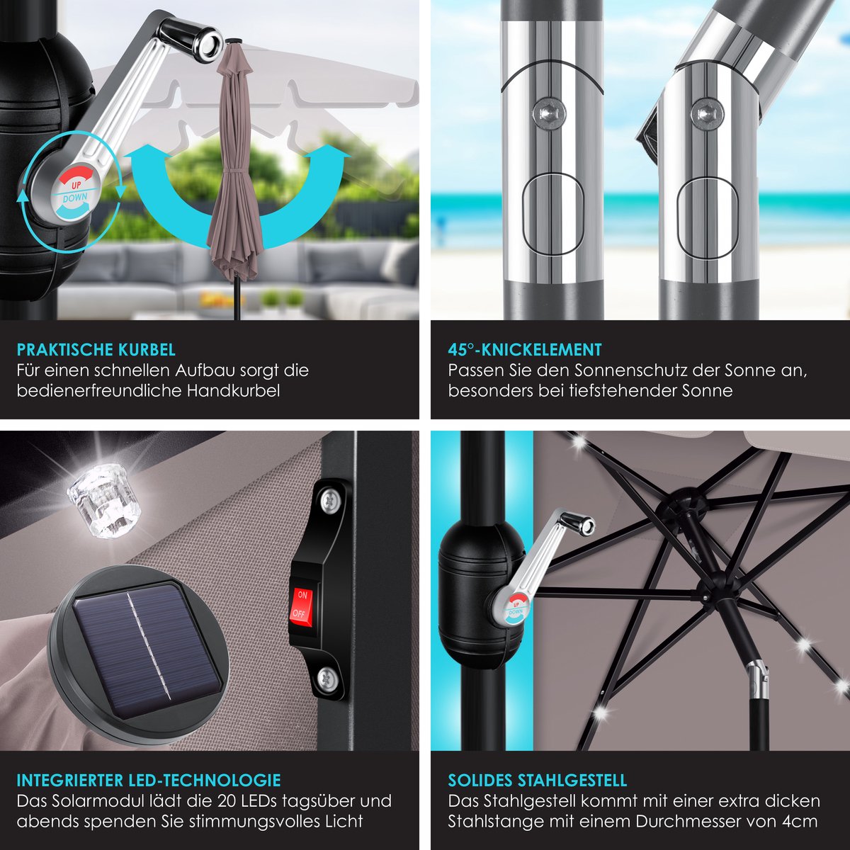 Een bijzonder hoogtepunt van de tuinparasol zijn de geïntegreerde krachtige LED's, die voor een gezellige sfeer zorgen en daarom ook geschikt zijn voor 's avonds. De zonnemodule laadt de LED's op met daglicht en er is geen batterij nodig. De LED's zijn zo geplaatst dat ze zorgen voor een gelijkmatige verlichting van de parasol en een aangename verlichting van de buitenruimte.