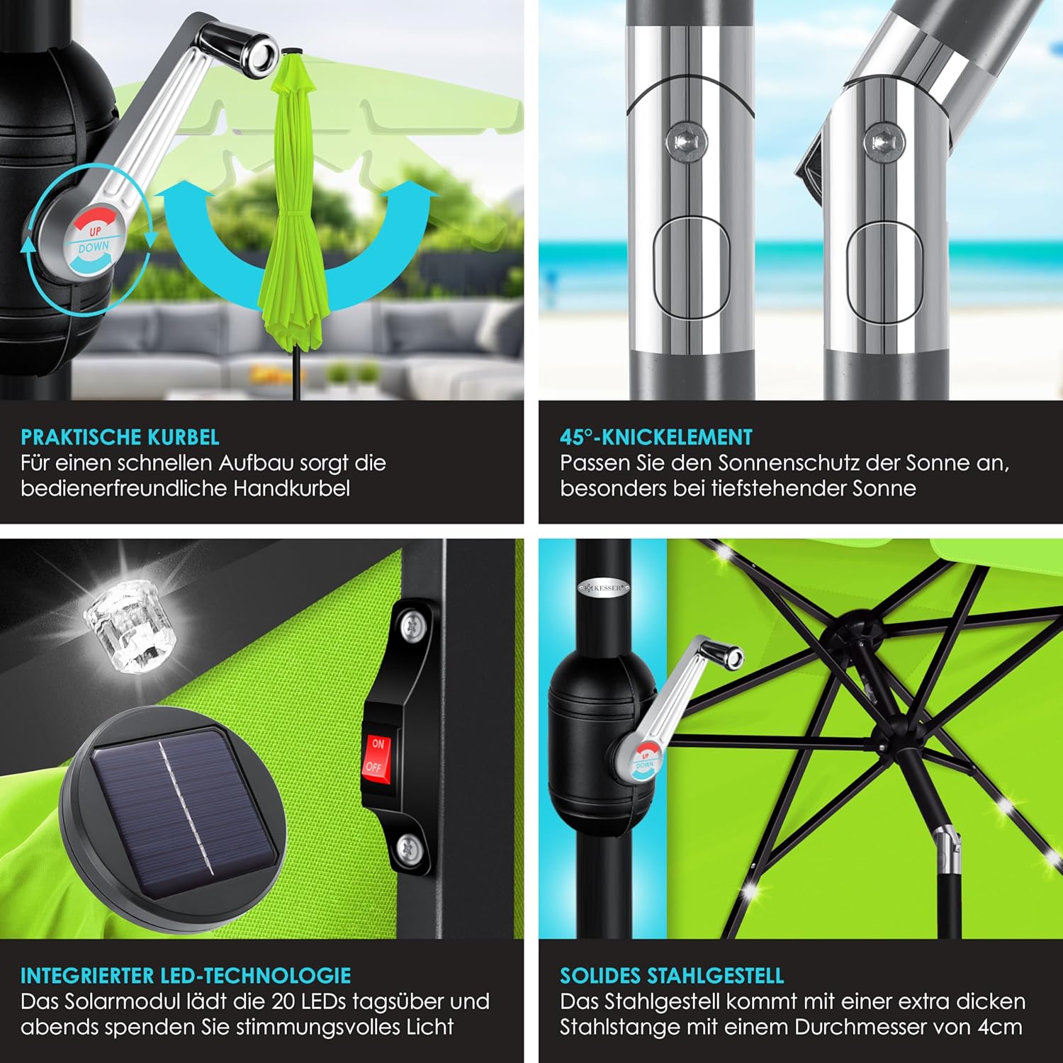 • Ledverlichting: een bijzonder hoogtepunt van de parasol zijn de geïntegreerde krachtige leds, die voor een gezellige sfeer zorgen en dus ook geschikt zijn voor de avond. Het zonnepaneel laadt de leds met daglicht op en er is geen batterij nodig. De leds zijn zo geplaatst dat ze een gelijkmatige verlichting van het scherm garanderen en voor een aangename verlichting buitenshuis zorgen.