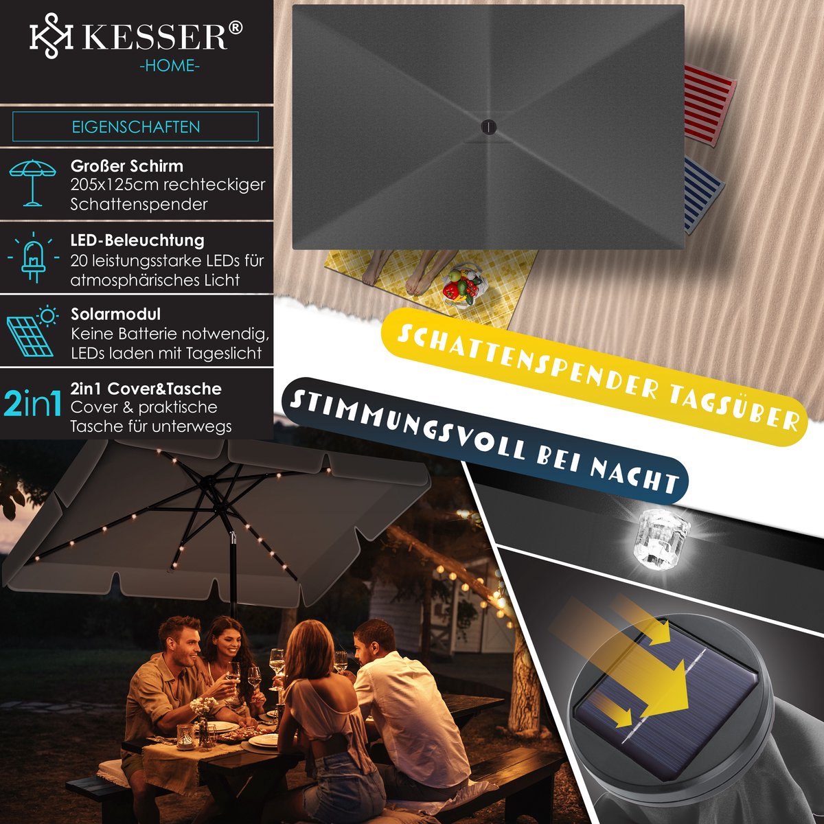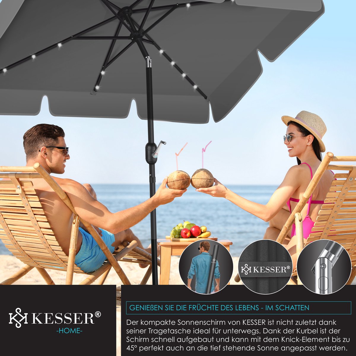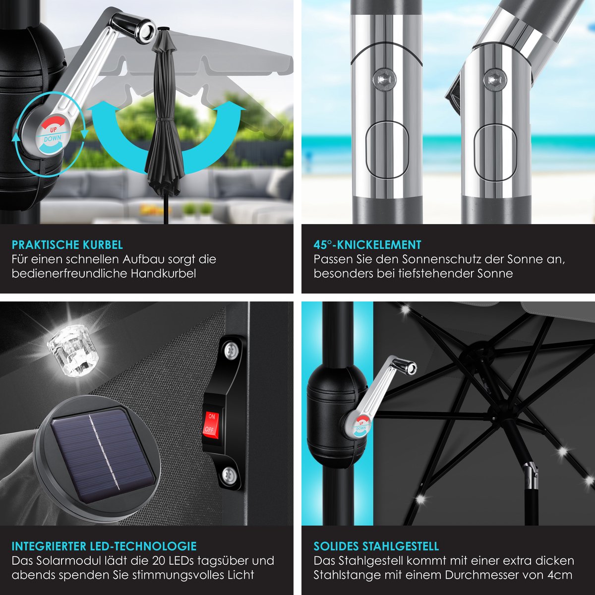 KESSER parasol LED met geïntegreerde knikverbinding voor ideale schaduw, stabiele roestvrijstalen en robuuste steunen, water- en UV-bescherming, opladen met daglicht dankzij geïntegreerde zonnemodule, incl. 2in1 hoes & tas