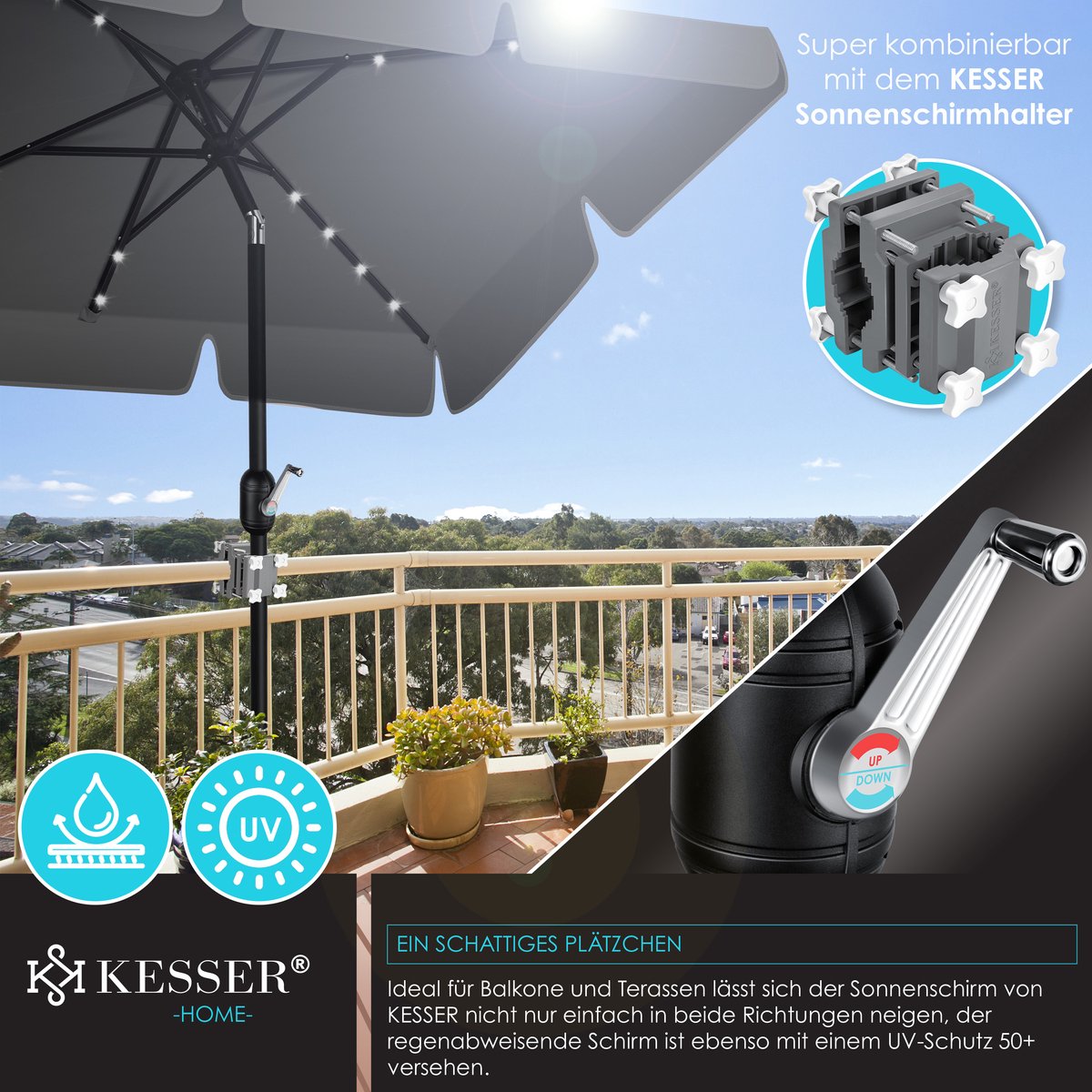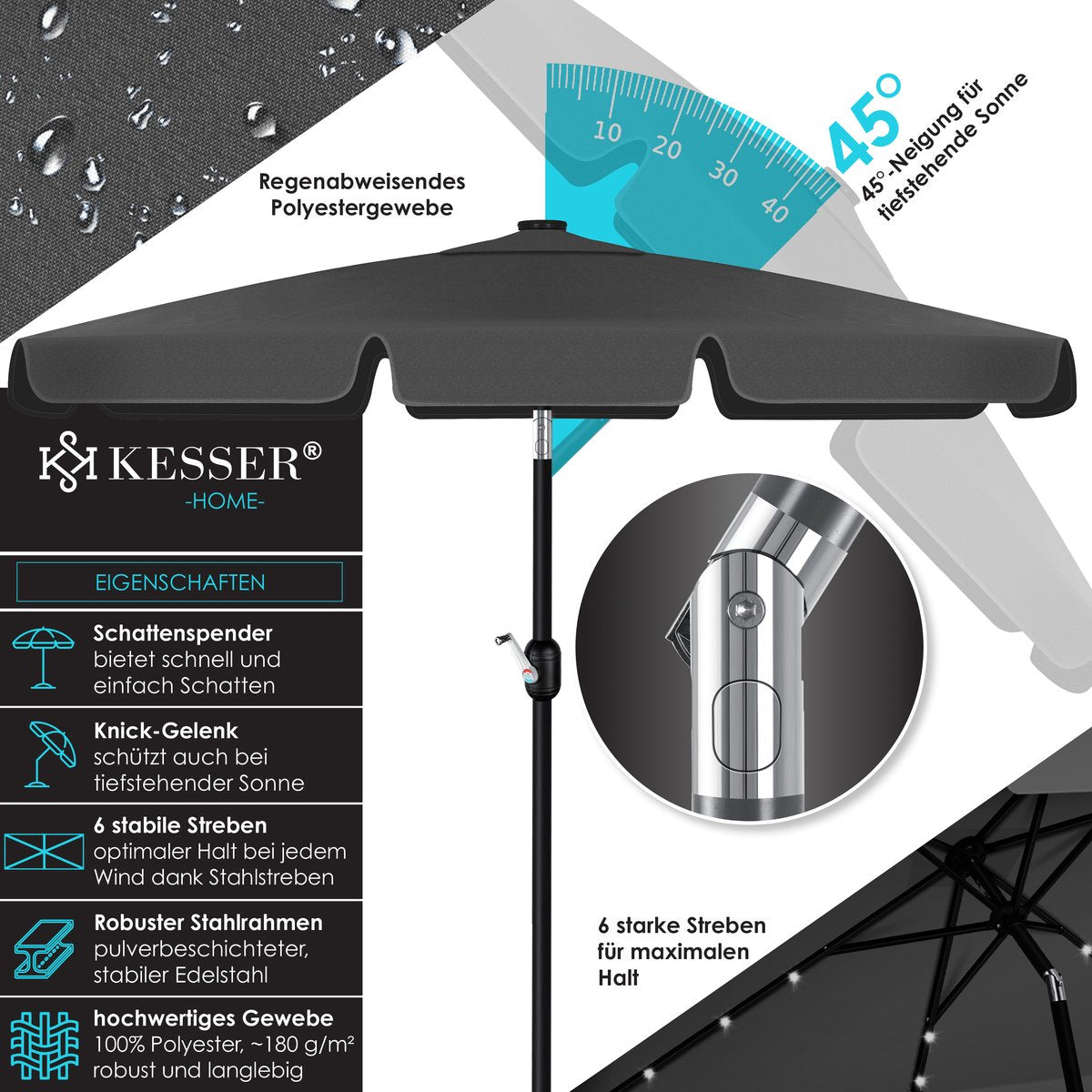 De stevige stokjes met een diameter van 4 cm zorgen voor een uitstekende stabiliteit van de balkonparaplu en maken hem windbestendig.Het frame is gemaakt van gepoedercoat staal, dat bijzonder robuust en duurzaam is.De hoogwaardige stof van 100% polyester met een gewicht van ~180g/m² is waterafstotend en is zelfs bestand tegen een lichte regenbui.Voor een veilige en stabiele installatie van de parasol kan deze worden gecombineerd met de KESSER parasolhouder .