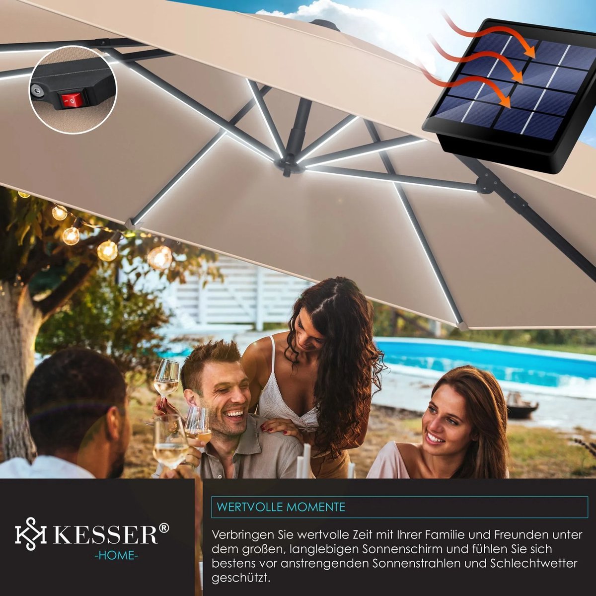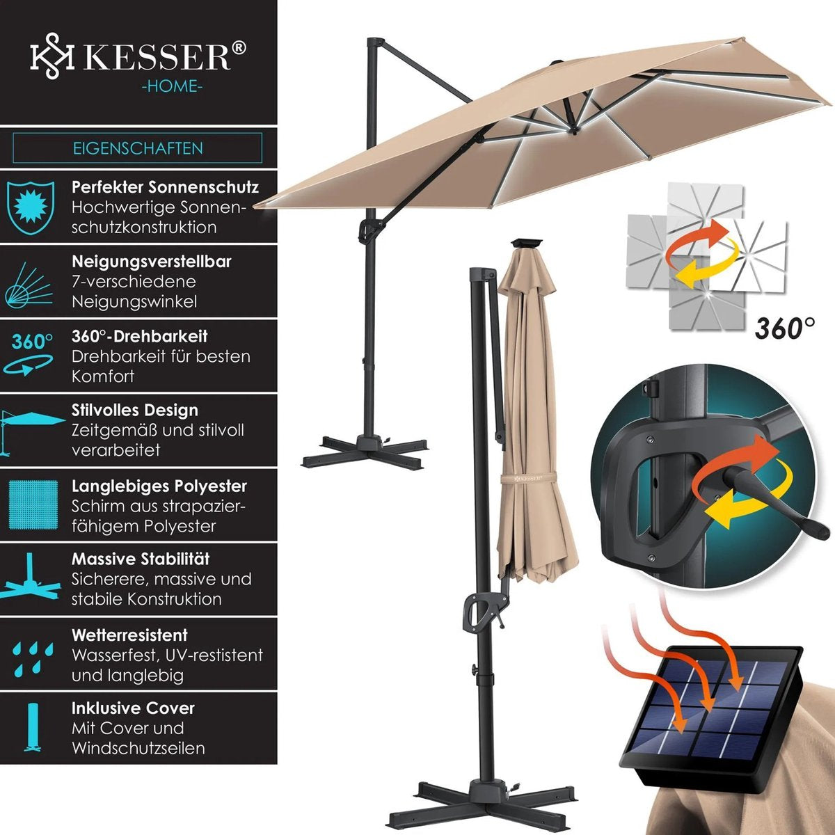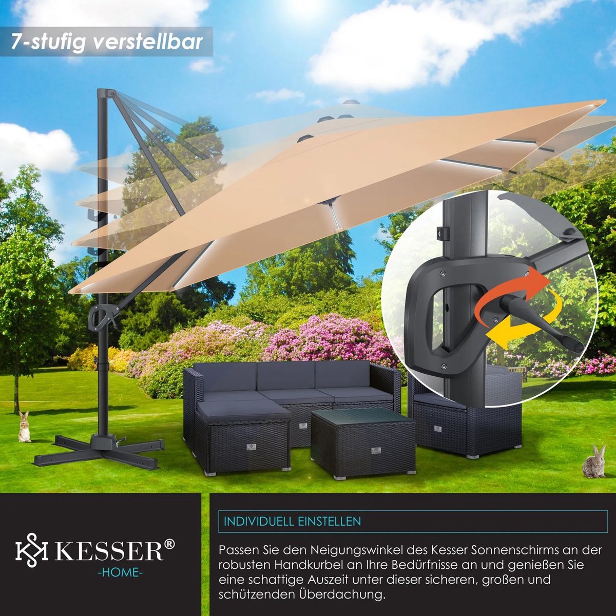 Grote zweefparasol: De KESSER SUN XL parasol met de afmetingen 300 x 300 cm biedt een royaal schaduwoppervlak bij barbecues en familieontbijtjes op het terras en biedt optimale bescherming tegen de zon.