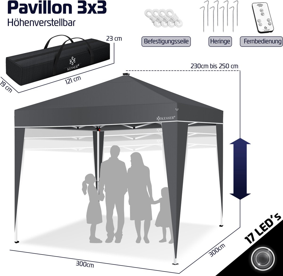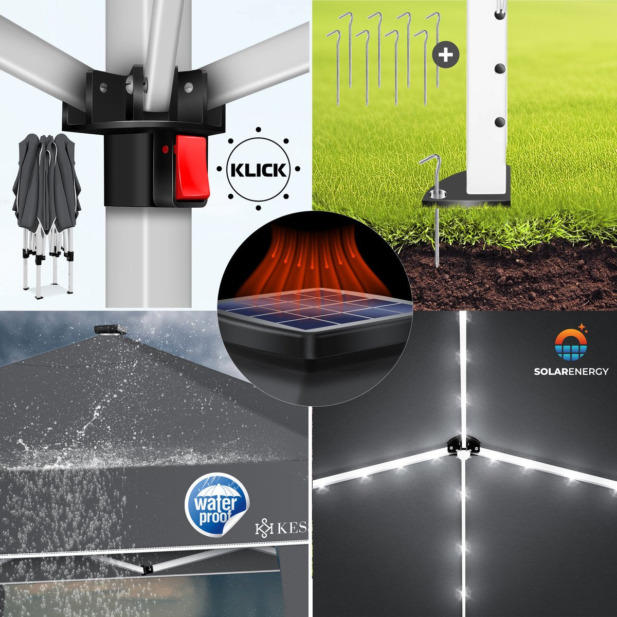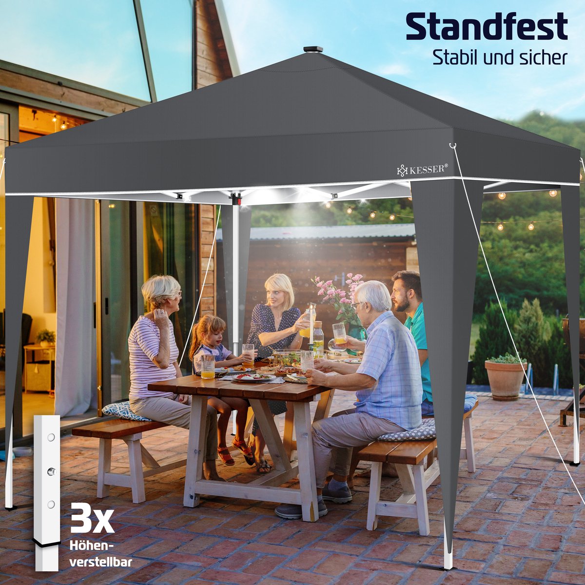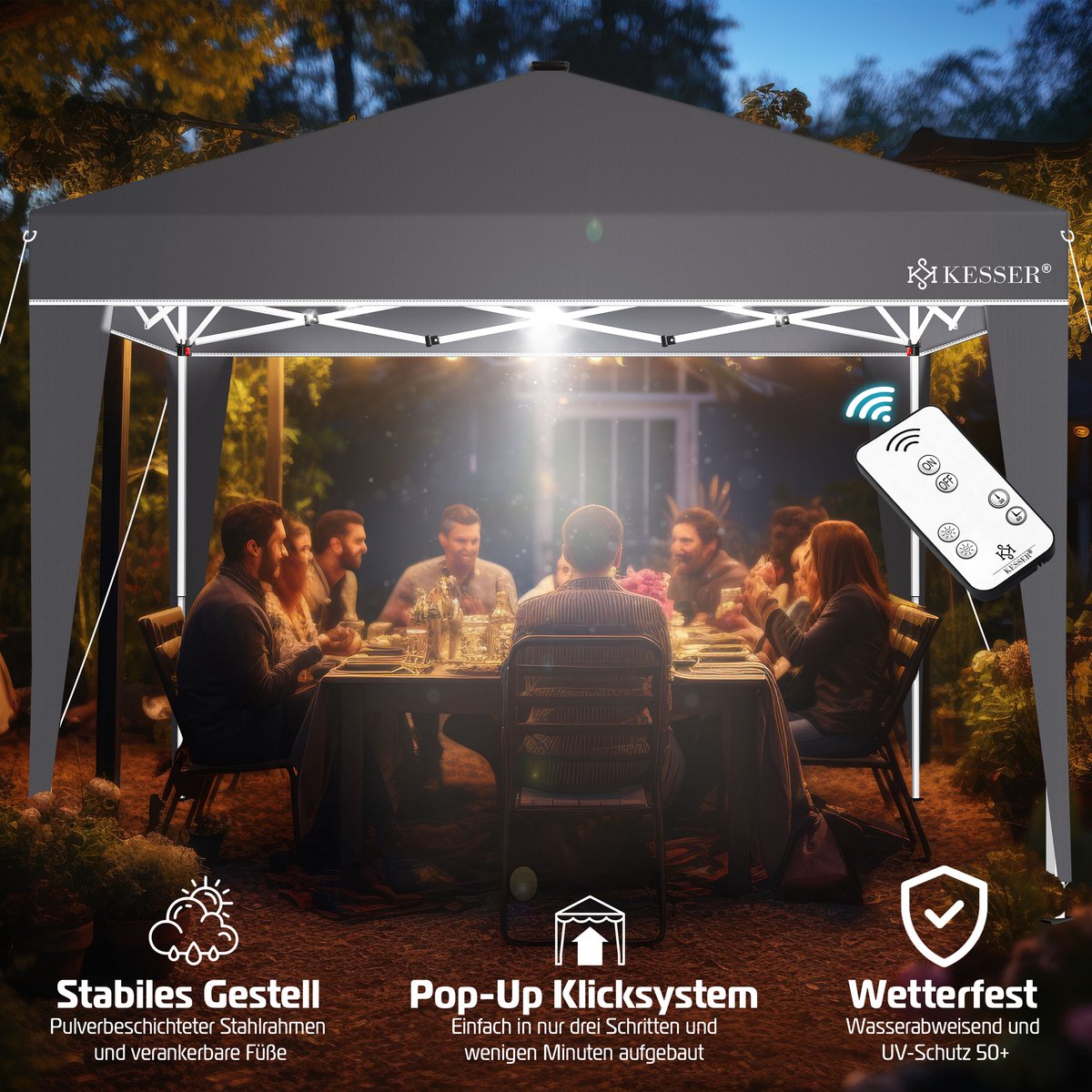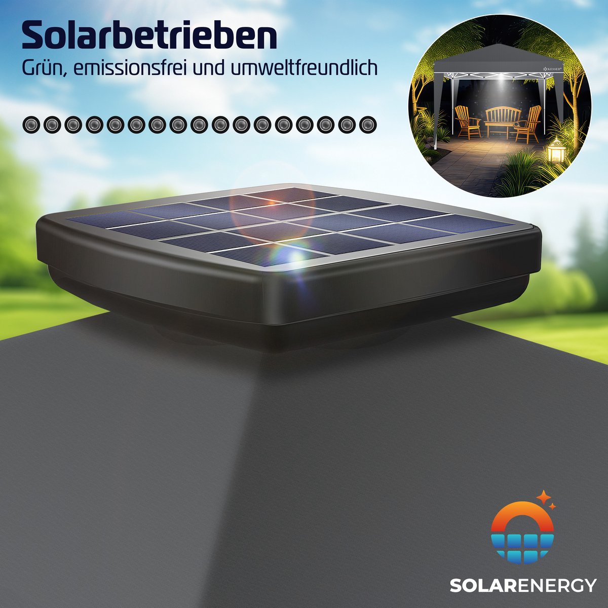 KESSER Paviljoen met UV-bescherming 50+, waterafstotende 220D Oxford-stof, snelle opbouw dankzij Click & Push-systeem. 3-voudig in hoogte verstelbaar, stabiele verankering, scheurvaste touwen voor extra stabiliteit. Draagtas, zonnepaneel met 17 LED’s. Pop-up kliksysteem, gepoedercoat stalen frame. De ideale metgezel voor buitengebruik!