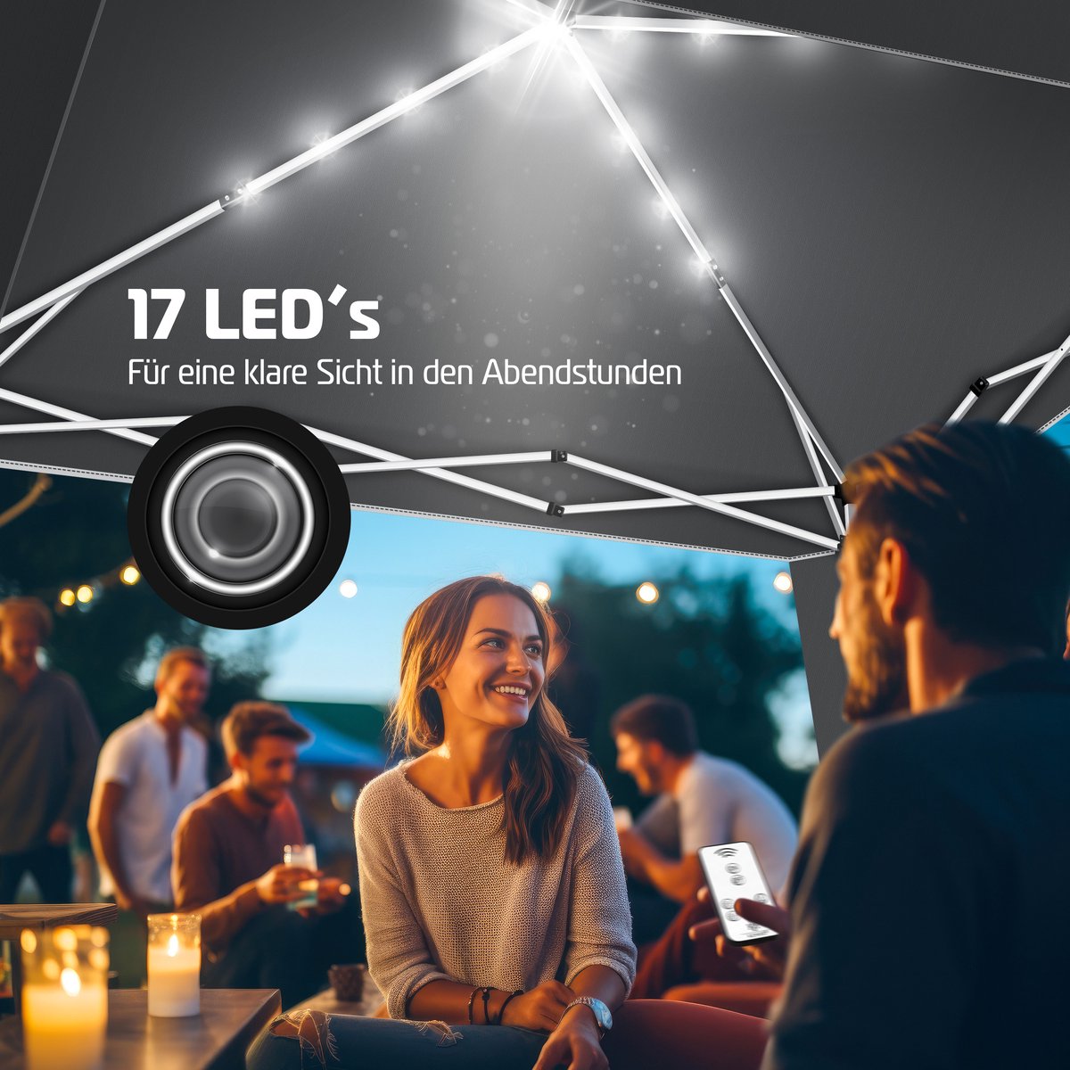 MOBIEL EN STIJLVOL: De meegeleverde draagtas maakt het transport eenvoudig. Licht en compact – perfect voor picknicks, stranduitjes, tuinfeesten en meer. Het geïntegreerde zonnepaneel met 17 LED’s zorgt voor sfeervolle verlichting tijdens avondelijke buitenactiviteiten. Mobiel, stijlvol en functioneel – de tuinpaviljoen verenigt alles in één product.