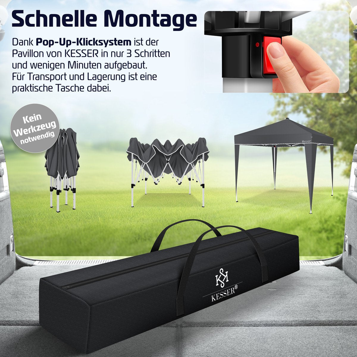 SUPERSNELLE OPBOUW: Het innovatieve Click & Push-systeem zorgt voor een snelle en eenvoudige opbouw van de vouwtent. Binnen enkele minuten staat het paviljoen stevig en stabiel. Deze tijdbesparende functie is vooral handig bij spontane evenementen of onverwachte weersveranderingen.