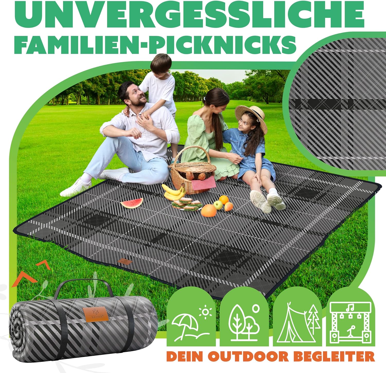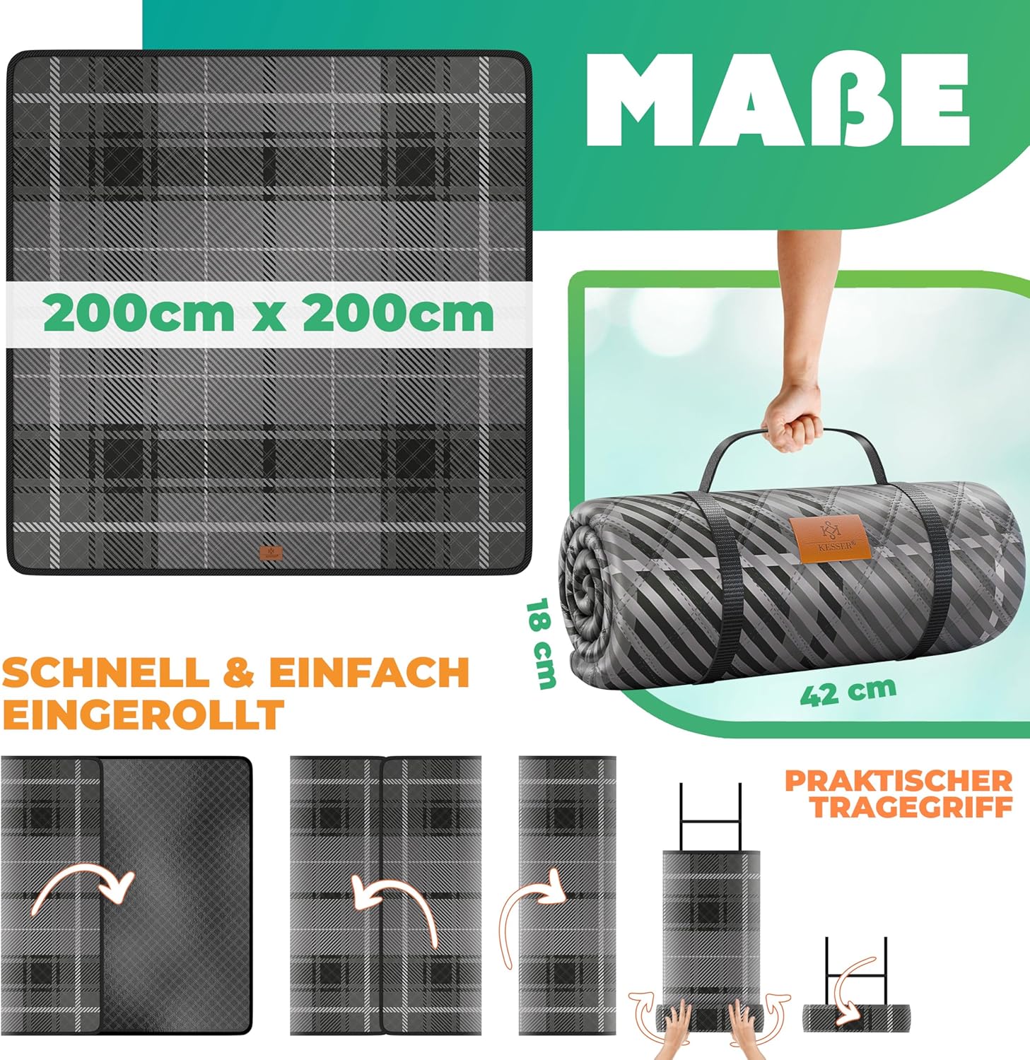 • Praktische draaggreep en snelle installatie voor een eenvoudige trap: de KESSER picknickdeken is de ideale metgezel voor onderweg. Dankzij de praktische draaggreep en de mogelijkheid om de deken snel en eenvoudig op te rollen, is hij gemakkelijk te vervoeren en ruimtebesparend op te bergen. Zo heb je je picknickdeken altijd binnen handbereik, waar je ook gaat.