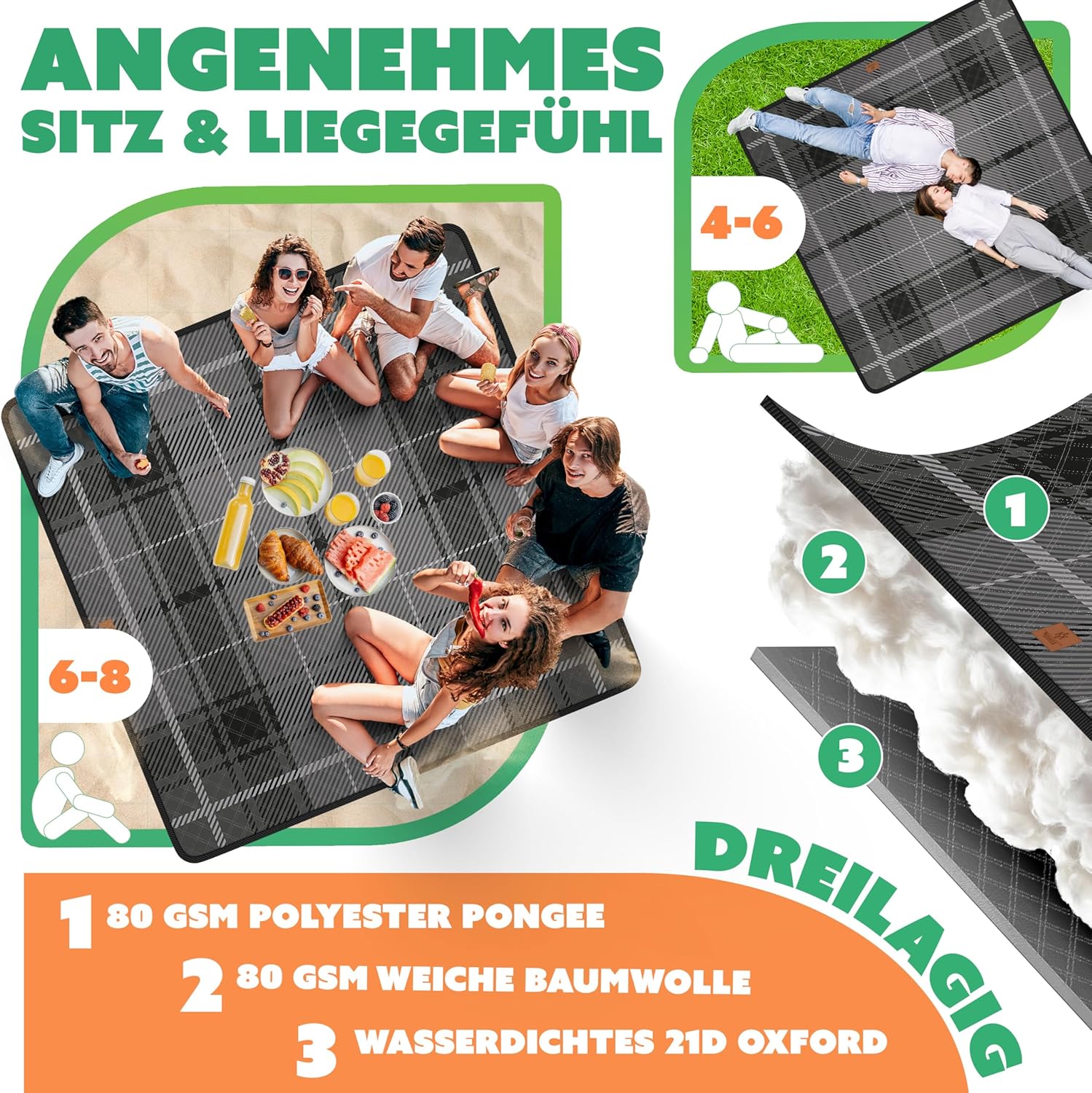 • Duurzame constructie voor de hoogste comfort en duurzaamheid: de KESSER picknickdeken bestaat uit drie hoogwaardige lagen: 180 g/m² polyester pongé, 180 g/m² zacht katoen en een waterdichte 21D Oxford. Onderkant. Deze combinatie zorgt voor een aangenaam zit- en liggevoel, terwijl de robuuste constructie een lange levensduur garandeert.