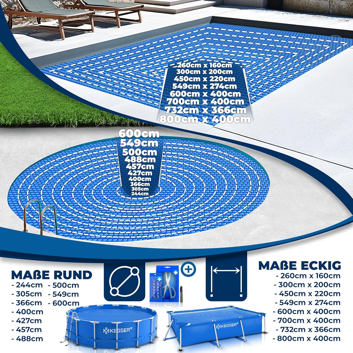 Verkrijgbaar in verschillende maten, efficiënte warmteopslag, compatibel met vele zwembaden, UV- en weerbestendig, chloorbestendig, milieuvriendelijk, vuilinvalbeveiliging, vermindert waterverdamping, vermindert verwarmingskosten, oprolbaar (zwembadroller van KESSER), snel opwarmen van 3-7 graden Celsius