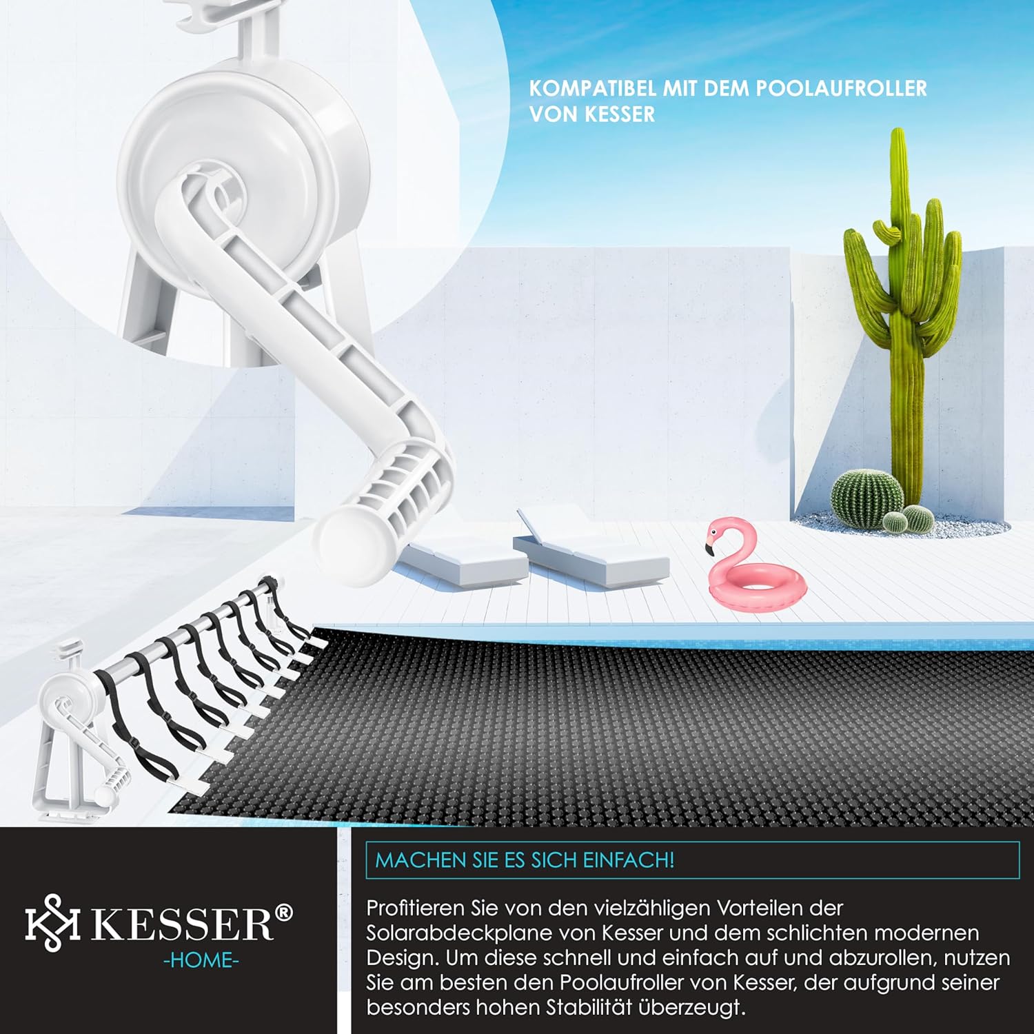 Verkrijgbaar in verschillende maten. Efficiënte warmteopslag, compatibel met vele zwembaden, uv- en weerbestendig, chloorbestendig, milieuvriendelijk, vuilinvalbescherming, vermindert waterverdamping, vermindert verwarmingskosten, oprolbaar (zwembadhaspel van KESSER), snel opwarmen van 3-7 °C