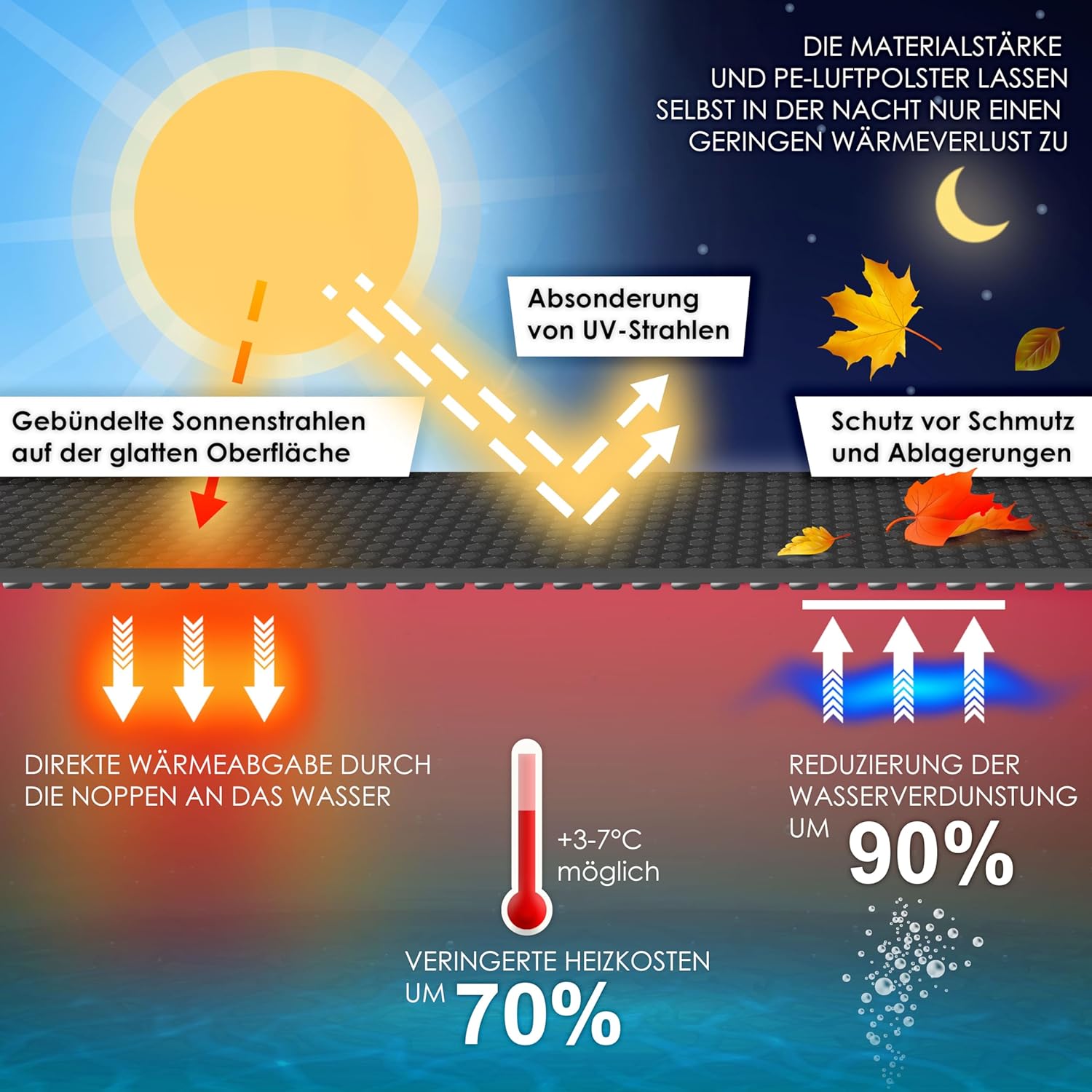 Het principe van onze afdekfolie is heel eenvoudig. De gebundelde zonnestralen stralen direct op het gladde oppervlak van de thermofolie. Via de noppen aan de andere kant van de folie vindt de directe warmteafgifte aan het water plaats. Bij dit proces wordt het water snel met 3-7 °C verwarmd, daarbij verlagen de verwarmingskosten met 70%. Door het zwembadzeil wordt de waterverdamping met 90% verminderd en laat het zwembad er niet leeg uitzien.