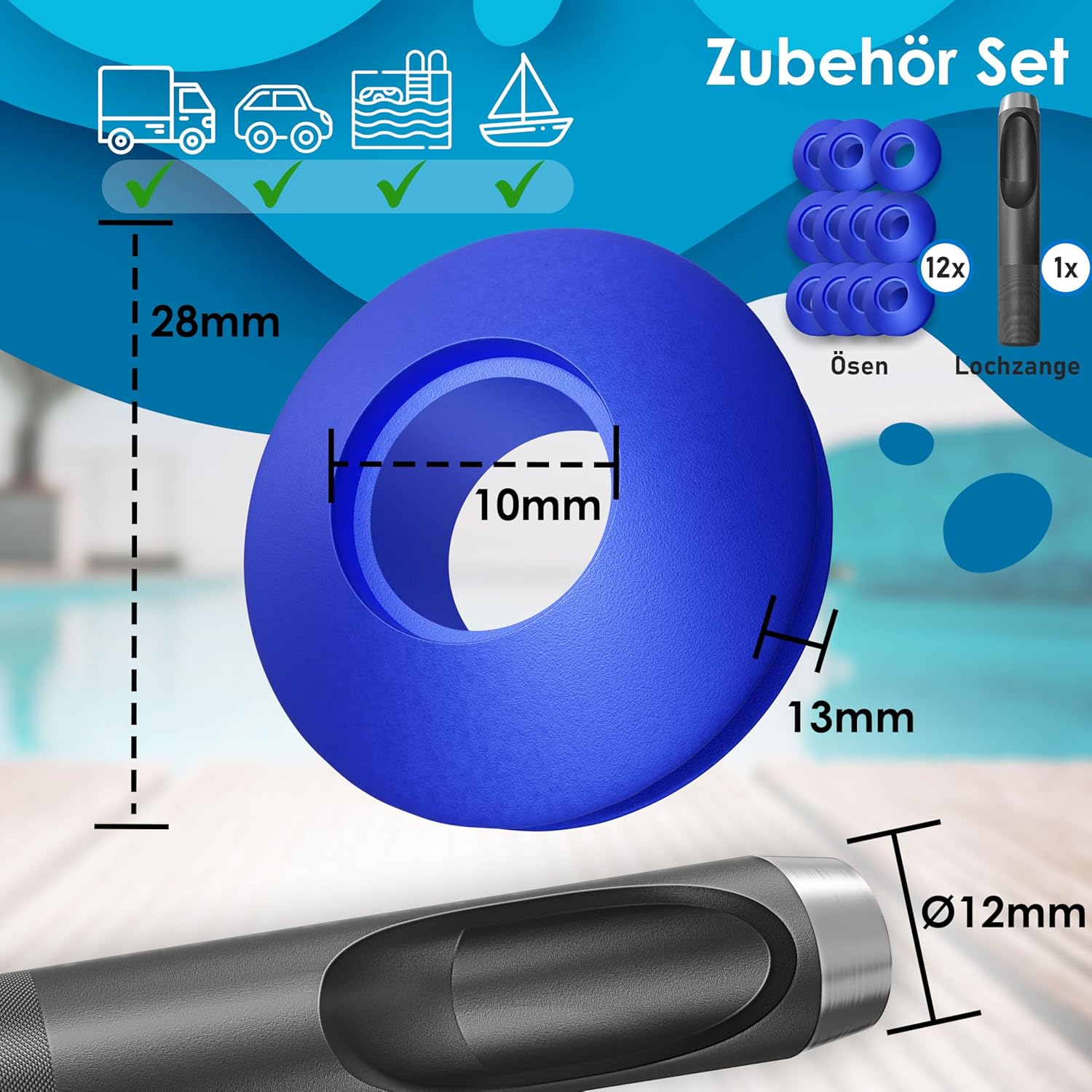 • Ideale bescherming: onze zonnefolie (incl. 1 x gatentang en 12 x ogen) beschermt niet alleen je portemonnee en het milieu, maar ook het water tegen vuil, insecten, bladeren en andere afzettingen. Het zonnezeil is verkrijgbaar voor vierkante en ronde zwembaden in verschillende maten. Onze geheime tip: knip het zonnezeil gemakkelijk en snel op maat voor je zwembad.