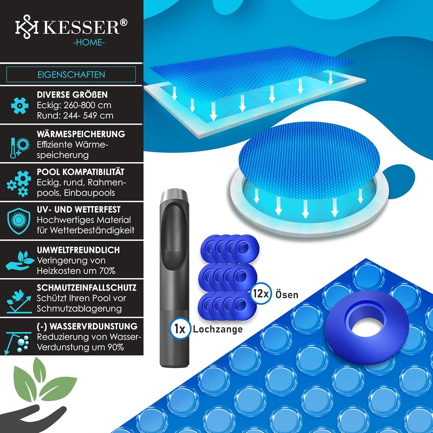 Verkrijgbaar in verschillende maten. Efficiënte warmteopslag. Compatibel met vele zwembaden, UV- en weerbestendig, chloorbestendig. Milieuvriendelijk. Vuilinvalbescherming, vermindert waterverdamping, vermindert verwarmingskosten, oprolbaar (zwembadroller van Kess), snel opwarmen van 3-7 °C