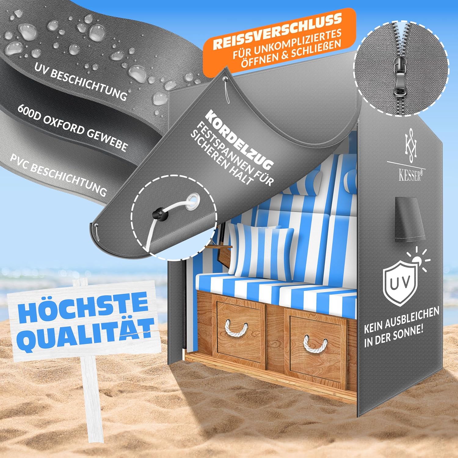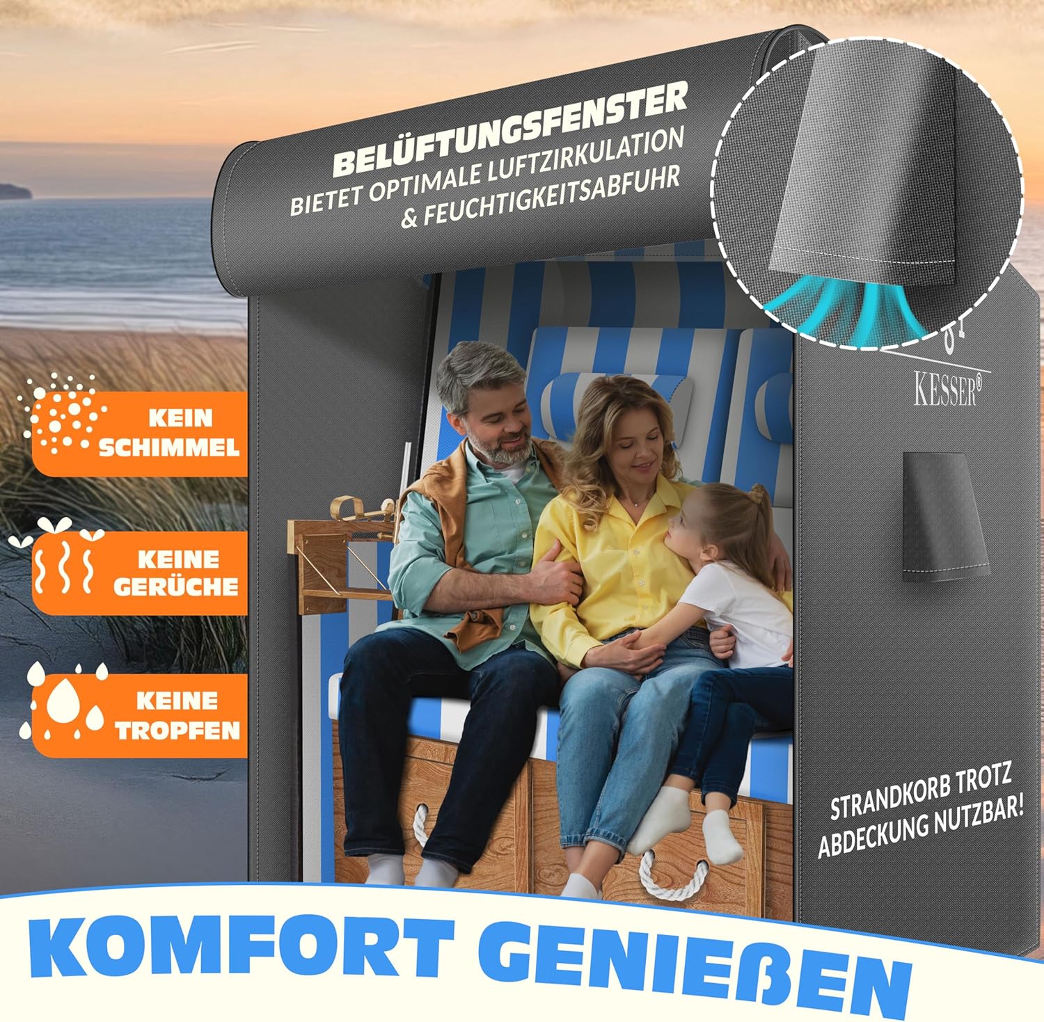 • Ventilatie en veilige bescherming: vocht kan via de verborgen ventilatieopeningen naar buiten worden afgevoerd. Hoogwaardig afgewerkte ritssluitingen vergemakkelijken het aan- en uittrekken. Voor een veilige bescherming bij weer en wind hebben wij de afdekking uitgerust met een trekkoord met aluminium ogen, dit zorgt voor een veilige grip op je strandstoel en beschermt tegen wind en wegglijden.