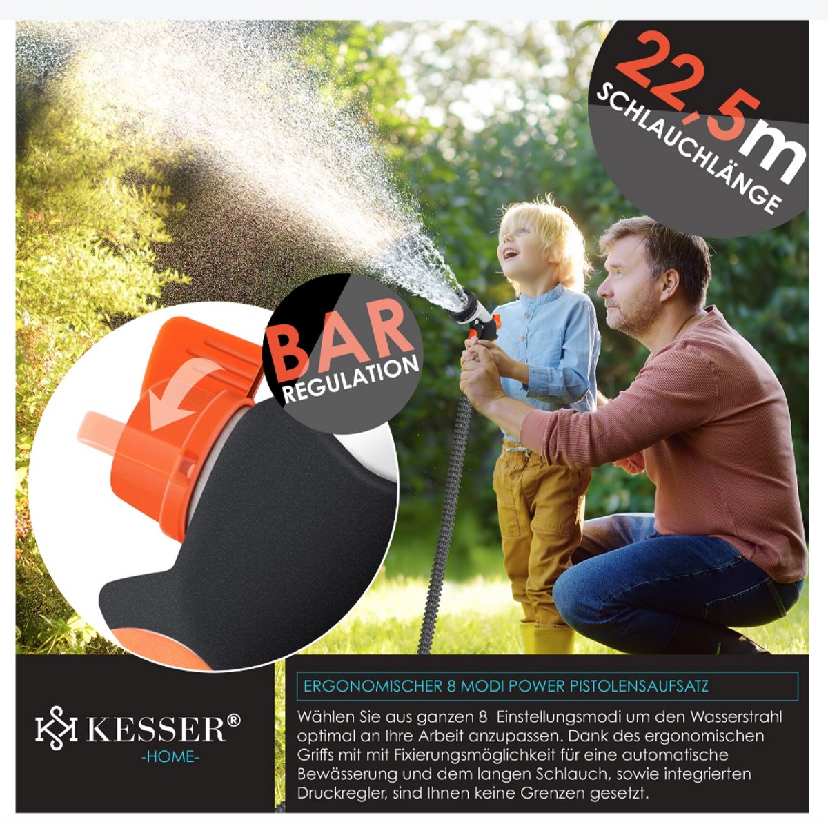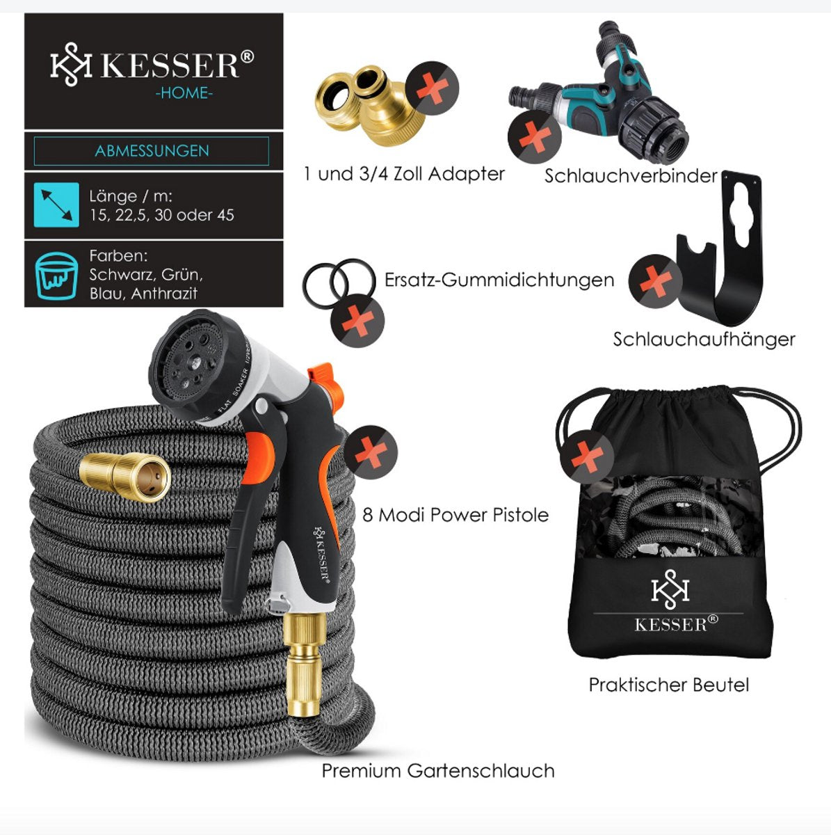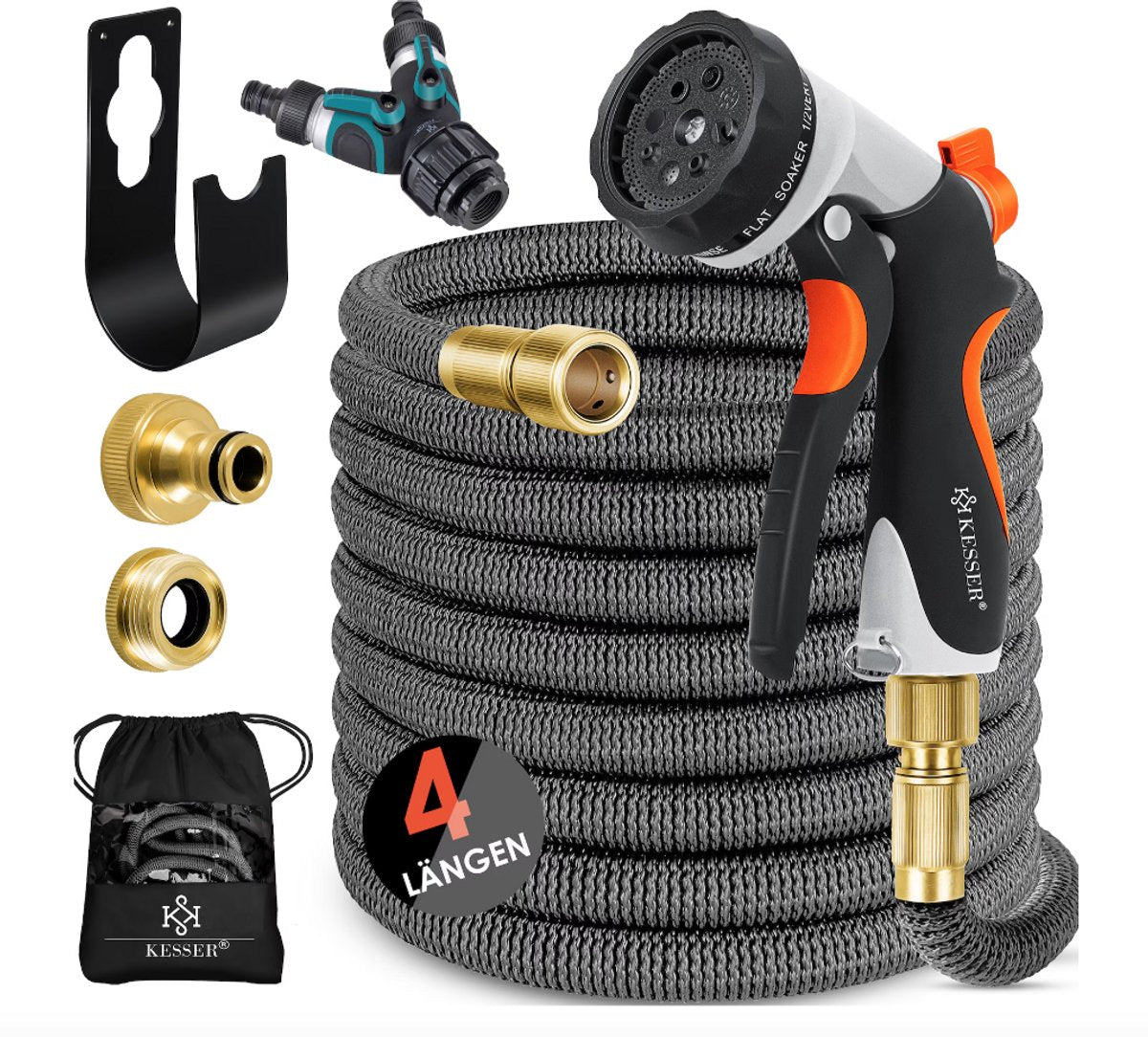 KESSER Premium tuinslang met krachtig pistool en 8 straalstanden, inclusief wandmontagetoebehoren, geschikt voor een druk tot 10 bar, veelzijdig inzetbaar, UV- en weerbestendig dankzij roestvrij messing, inclusief drukregelaar en vele toebehoren