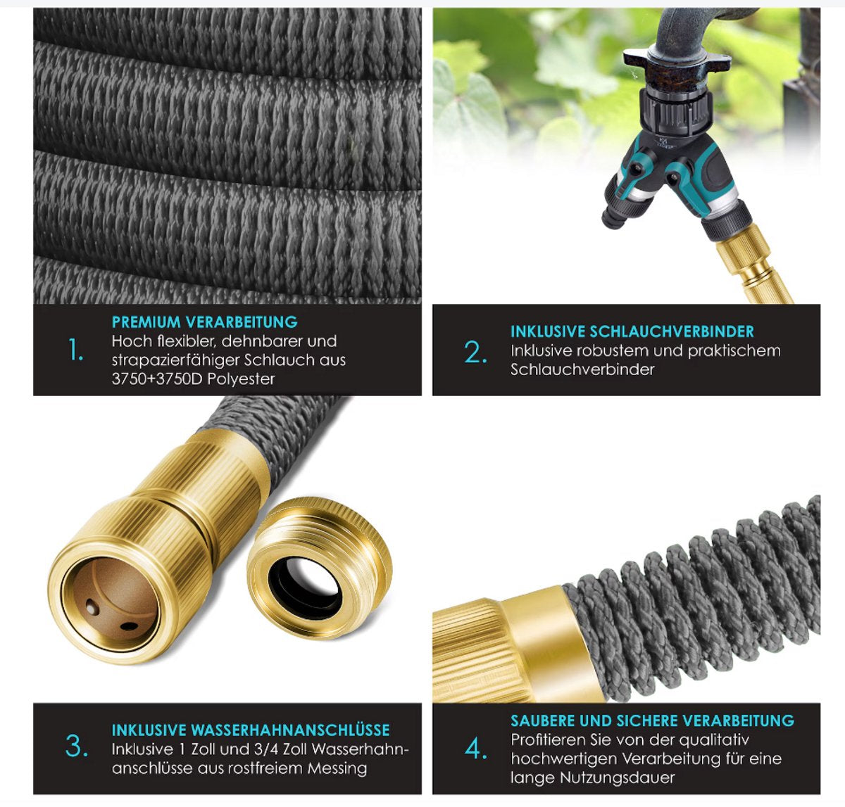 Robuuste materialen bieden talloze voordelen ten opzichte van conventionele tuinslangen . Door het gebruik van roestvrij messing en een duurzaam slangoppervlak is de waterslang UV- en weerbestendig . Dankzij de 1 en 3/4 inch adapters en de slangaansluiting heeft u altijd de perfecte aansluiting voor watertoegang .