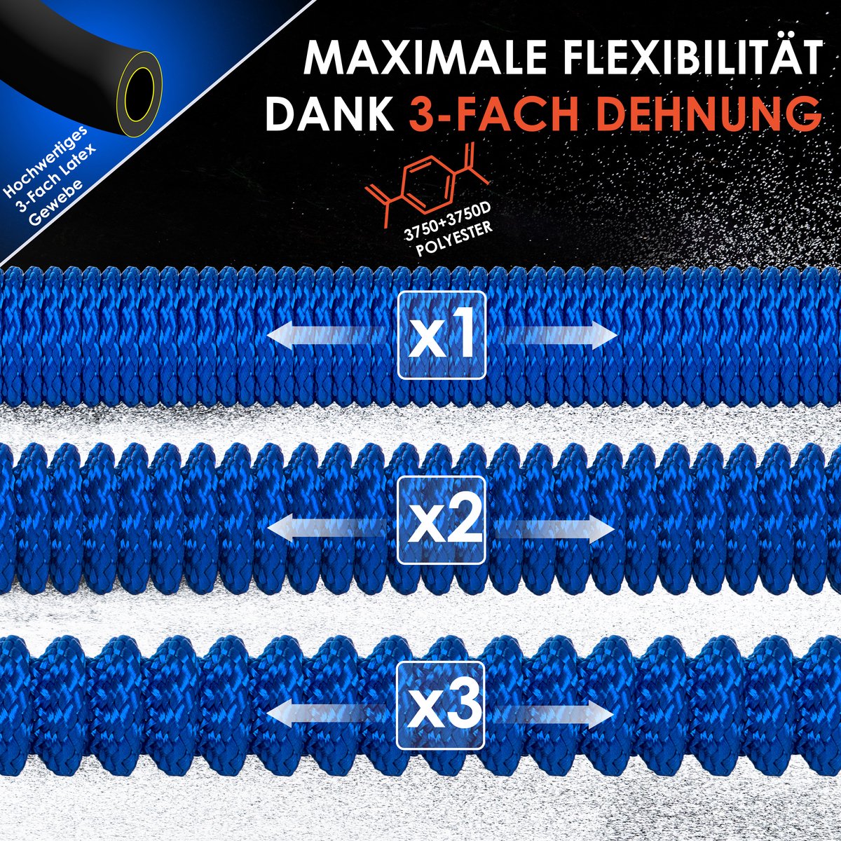 3-VOUDIGE UITZETTING: Bereik maximale flexibiliteit dankzij de 3-voudige uitzetting. Door hoogwaardig 3-laags latex weefsel en flexibel polyester rekt de tuinslang tot wel 3 keer zijn oorspronkelijke lengte uit. Het gebruikte materiaal aan de binnenzijde is bijzonder duurzaam en wordt niet broos, zodat u elke hoek in uw tuin kunt bereiken. Dankzij verschillende kleuren en maten is de perfecte tuinslang van het merk KESSER gegarandeerd beschikbaar voor u!
