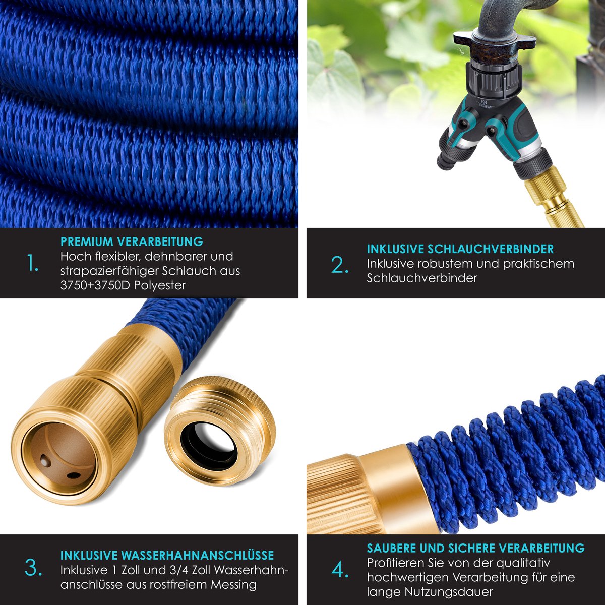 STERK EN HOOGWAARDIG: Door de hoogwaardige verwerking van stabiele en robuuste materialen zoals polyester en latex biedt deze tuinslang talrijke voordelen ten opzichte van conventionele tuinslangen. Het gebruik van roestvrij messing en een duurzaam slangoppervlak zorgen ervoor dat de waterslang UV- en weerbestendig is. Dankzij de 1 en 3/4 inch adapters en de slangverbinder heeft u altijd de perfecte aansluiting voor water beschikbaar.