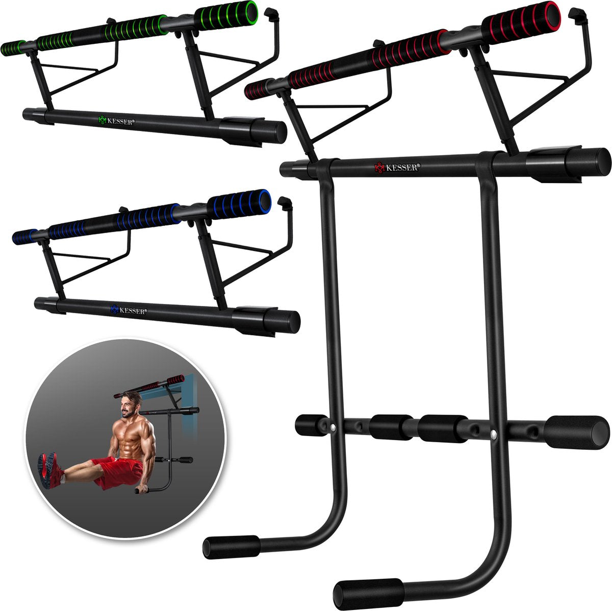 KESSER® 4in1 Premium Optrekstang inclusief DIP-Station & Power Ropes, inklapbare Deurrekstok, veilig inhangen in deurkozijnen, montage thuis zonder schroeven, Pull Up Bar