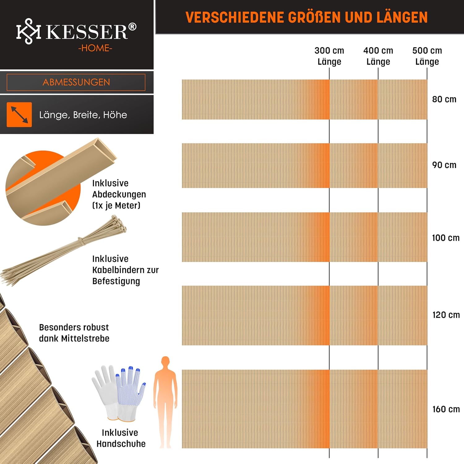 KESSER Pvc-inkijkbeschermingsmat in robuuste premium kwaliteit: waterbestendig, onderhoudsvriendelijk en stijlvol voor een betere bescherming tegen nieuwsgierige blikken met deze waterdichte en robuuste kijkklep bescherm je jezelf en je kinderen tegen nieuwsgierige blikken en geef je huis meer stijlVeelzijdige toepassingsmogelijkheden: van balkonbekleding tot afdekking tot omheining. Of het nu gaat om balkon, terras of tuin, deze duurzame mat past zich uitstekend aan alles aan.Belangrijkste kenmerken:Waterdicht, onderhoudsarm, bescherming van de privacy, duurzaam, bestendig en duurzaam bij alle weersomstandigheden, schimmelvrij, luchtdoorlatend, ondoorzichtig, natuurlijke look, decoratie / verfraaiing voor het balkon, eenvoudige montage, breedte en lengte kunnen gemakkelijk worden ingekort. Zonwering. Technische gegevens:Materiaal: Robuust pvc. Hoogtekeuze: 80 cm, 90 cm, 100 cm, 120 cm, 160 cm. Lengte naar keuze: 3 m, 4 m, 5 m. Kleur: bamboe, bruin, antraciet (afhankelijk van de keuze). Inhoud levering:1 x eenmalig pvc-zichtscherm, 1 x verpakking kabelbinders, 1 x handleiding (mogelijk niet beschikbaar in het Nederlands)