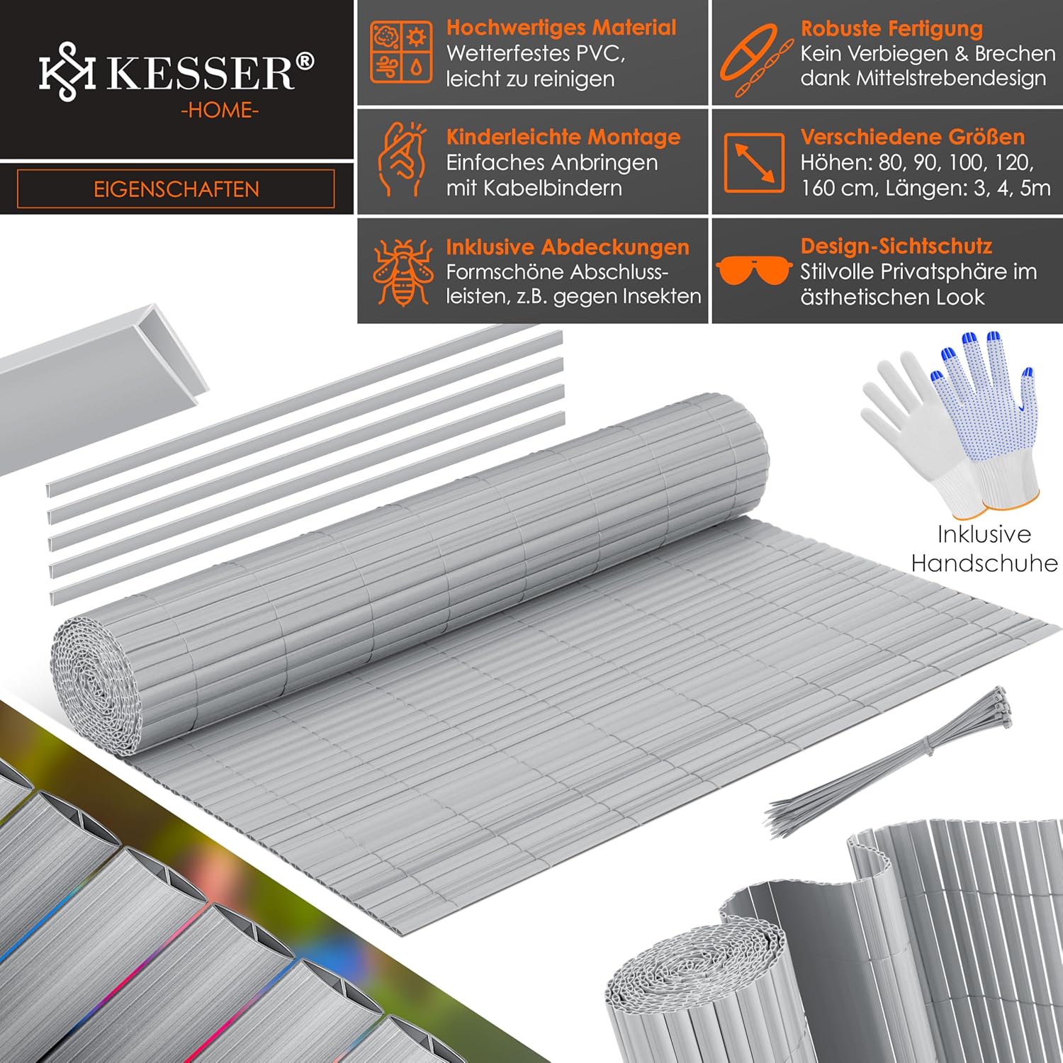 • Versiering: het natuurlijke uiterlijk van het stijlvolle privacyscherm van KESSER geeft je huis meer charme en past zich aan de natuurlijke omgeving aan. De perfect gevormde zichtbeschermingsmat biedt een bijzonder esthetische look en kan ook in je tuin naast een goede inkijkbescherming als designelement dienen. Daarnaast zijn mooi gevormde afsluitstrips inbegrepen, die niet alleen een bijzonder mooi design bieden, maar ook effectief insecten buiten houden.