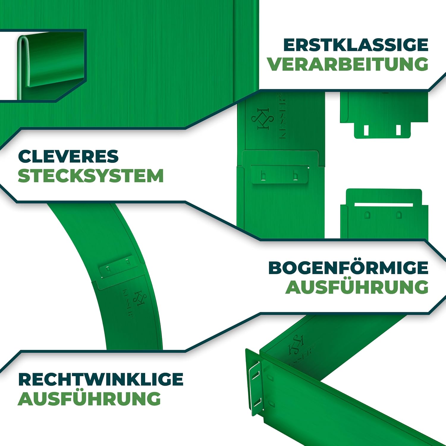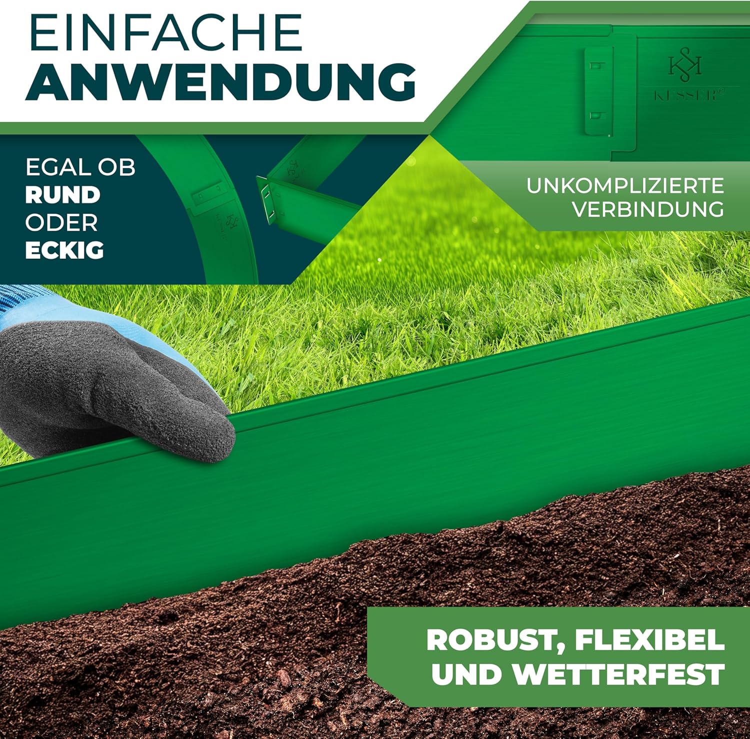 • Flexibel en robuust: ook gebogen vormen kunnen met de afscheiding worden gemaakt, omdat onze gazonranden gemakkelijk kunnen worden gebogen om met het insteeksysteem stabiele golvende lijnen te krijgen. Je kunt elke vorm inperken, of het nu recht, hoekig of rond is. Pas de KESSER gazonrand aan je tuin aan. Dankzij het robuuste materiaal en het insteeksysteem is de stabiliteit ook bij verschillende vormen gegarandeerd.