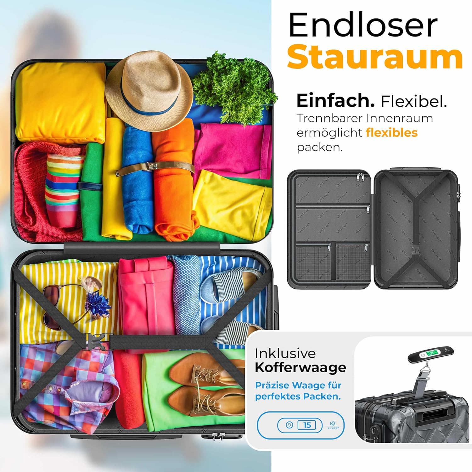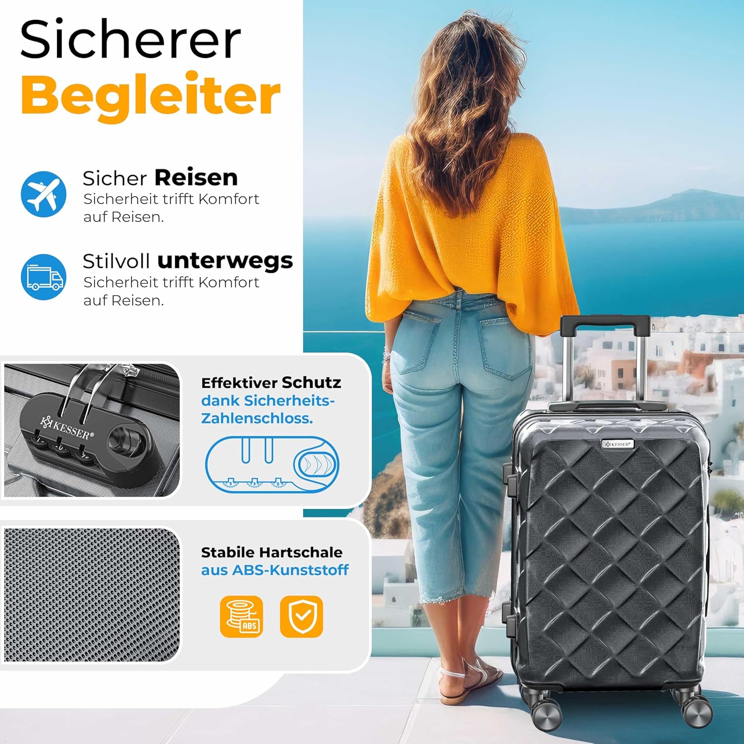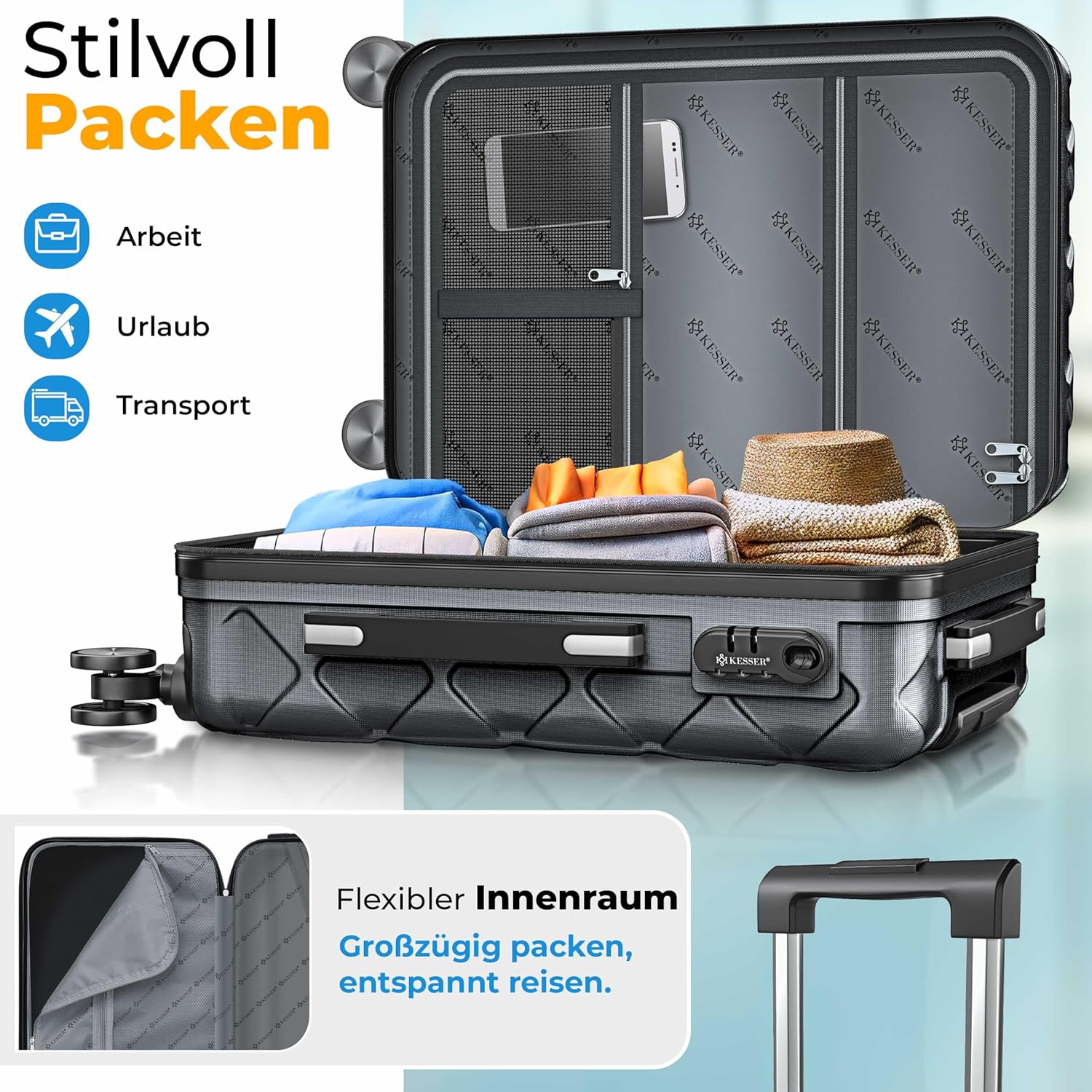Robuuste hardcase en maximale bescherming: de hoogwaardige ABS-harde schaal maakt de koffer extreem goed bestand tegen stoten, krassen en invloeden van buitenaf. Zo blijft je bagage ook op turbulente reizen optimaal beschermd. Of het nu in het vliegtuig, de trein of de auto is, met KESSER reis je zorgeloos en veilig.