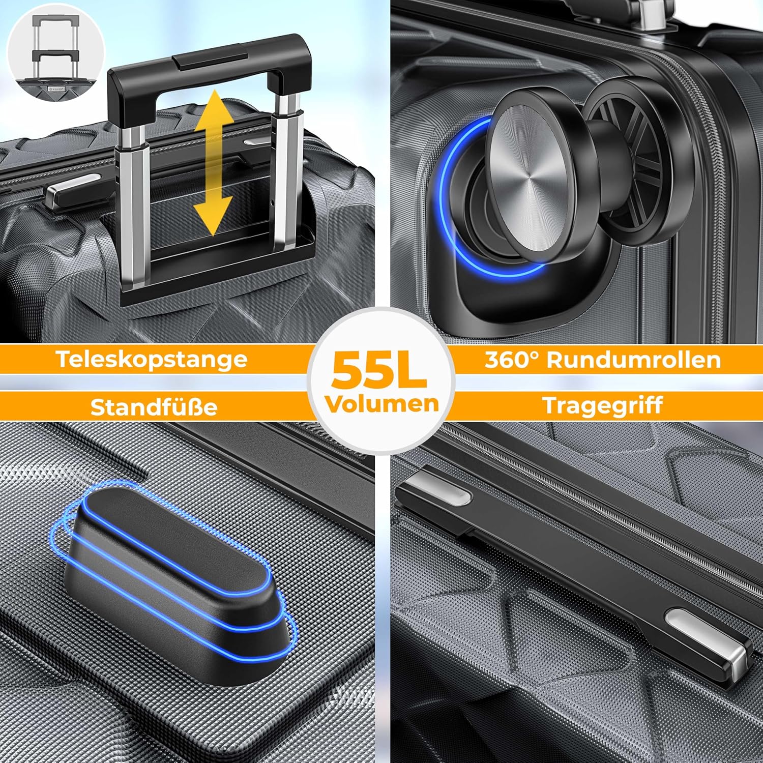 360 graden rondom en ergonomische hand: dankzij de vier hoogwaardige dubbele wielen kunnen de koffers moeiteloos in alle richtingen worden verplaatst. De 360° rondom besturing zorgt voor maximale beweeglijkheid op elke ondergrond. De in hoogte verstelbare telescoopstang en de zijdelingse en bovenste handgrepen zorgen voor maximaal comfort tijdens het transport.
