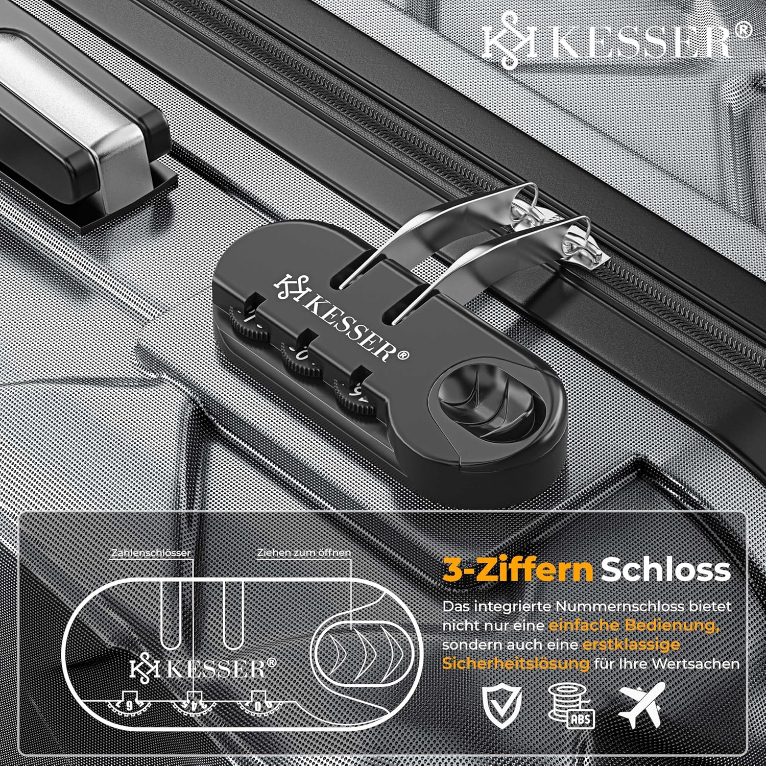 Geïntegreerde 3-tip-cijfersloten: veiligheid op reis is onmisbaar! Het geïntegreerde cijferslot beschermt je bagage betrouwbaar tegen ongeoorloofde toegang. Daarmee zijn je waardevolle spullen optimaal beveiligd: ideaal voor reizen met het vliegtuig of treinritten. Daarnaast zorgen de versterkte poten voor een stabiele grip wanneer de koffer wordt neergezet.