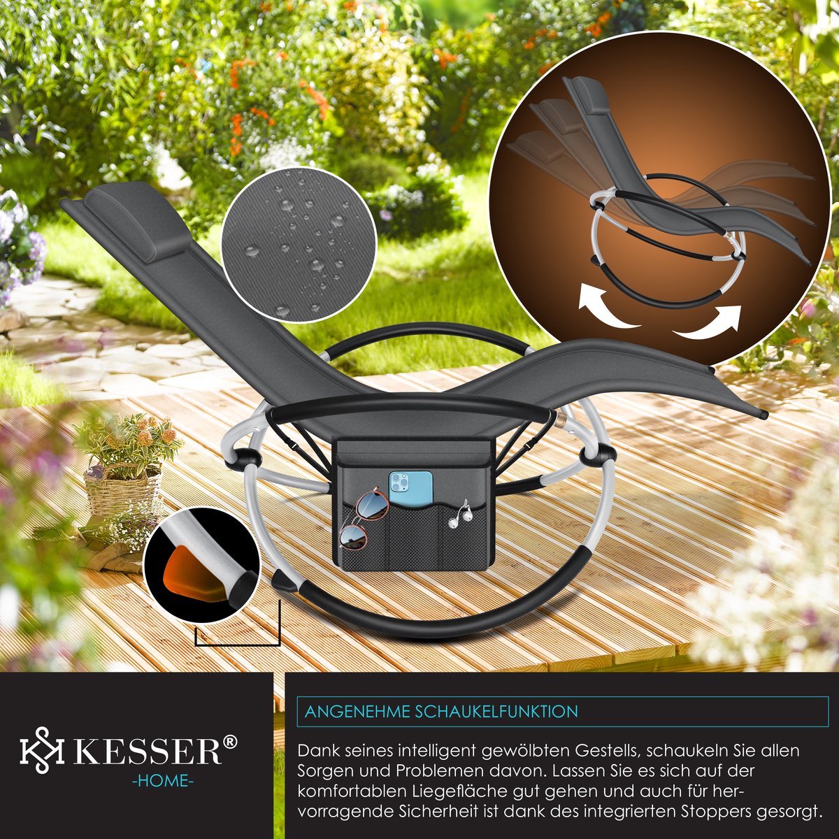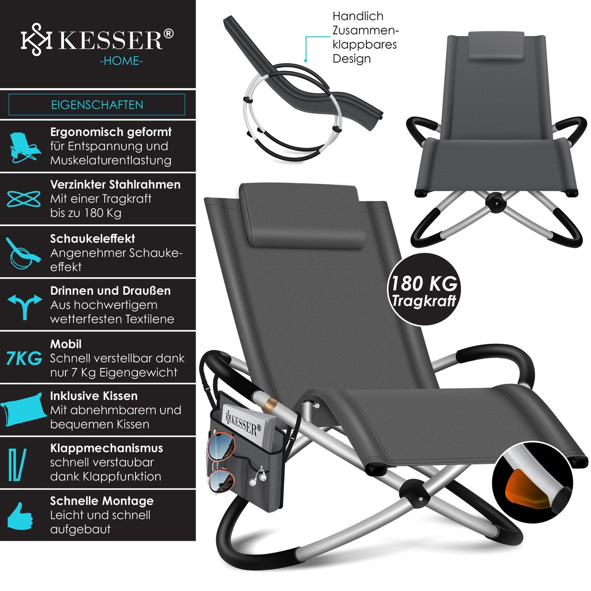 Maak van je tuin, balkon of terras een oase van ontspanning met de tuinligstoel van KESSER.Op de ergonomisch gevormde lounger wordt het einde van de werkdag, het weekend of de vakantie een rustgevende onderbreking van het hectische dagelijkse leven.De tuinligstoel van KESSER maakt het je gemakkelijk om er even lekker tussenuit te gaan .Met een nettogewicht van slechts 7 kg kan de aantrekkelijke rustzone gemakkelijk overal mee naartoe worden genomen.
