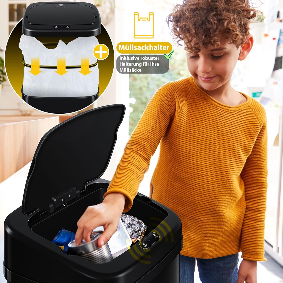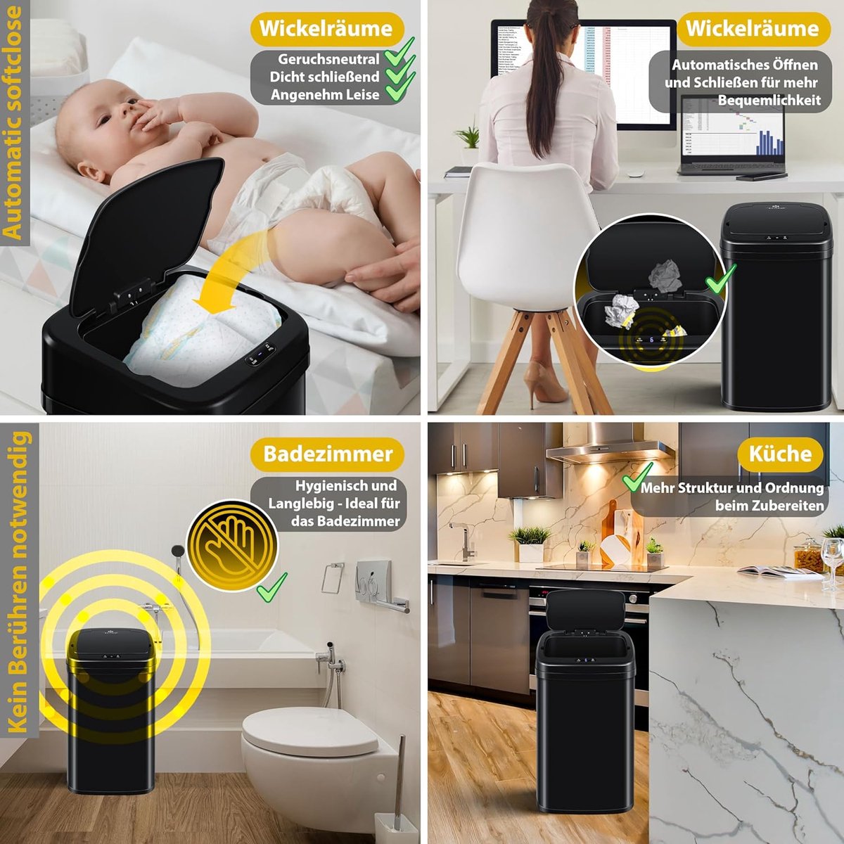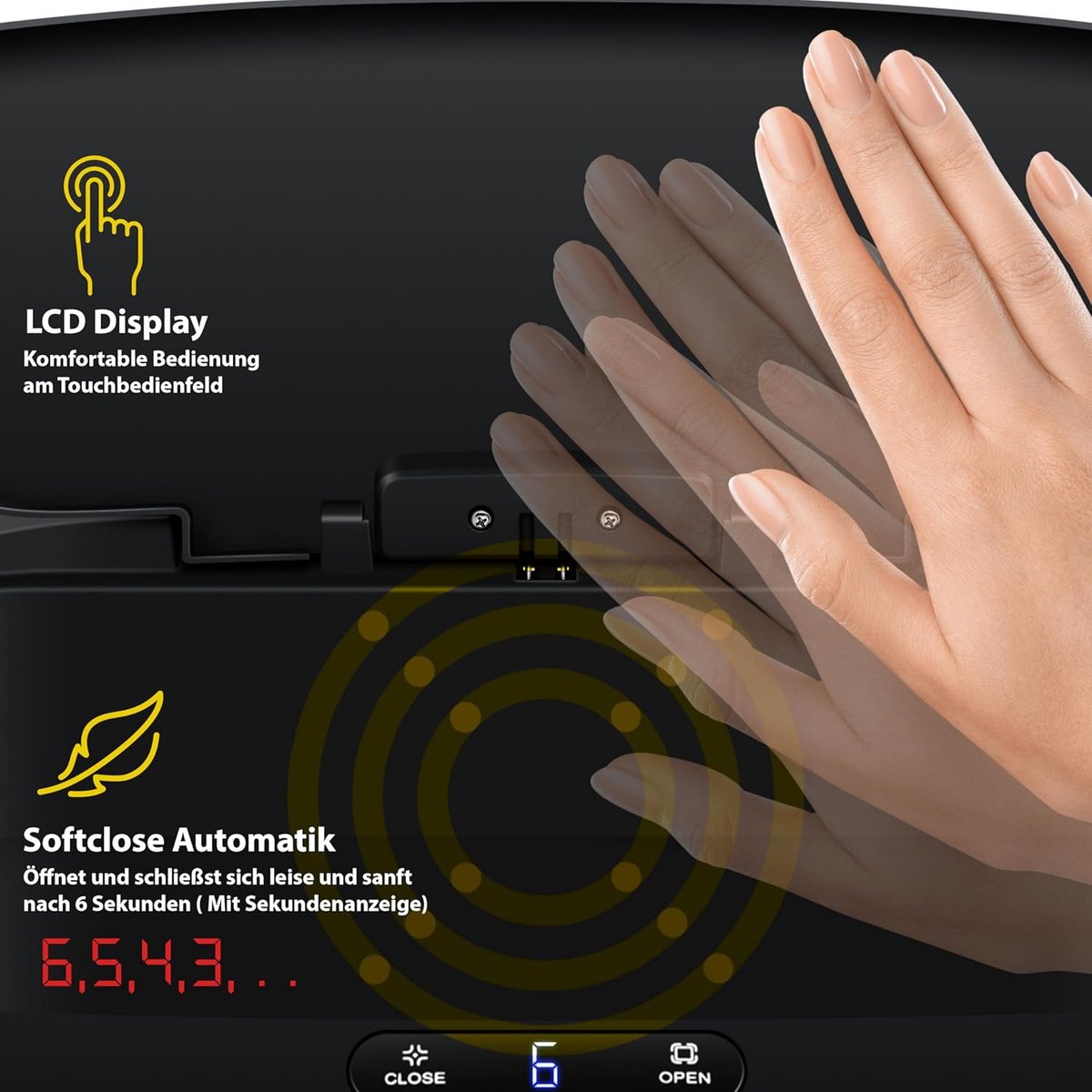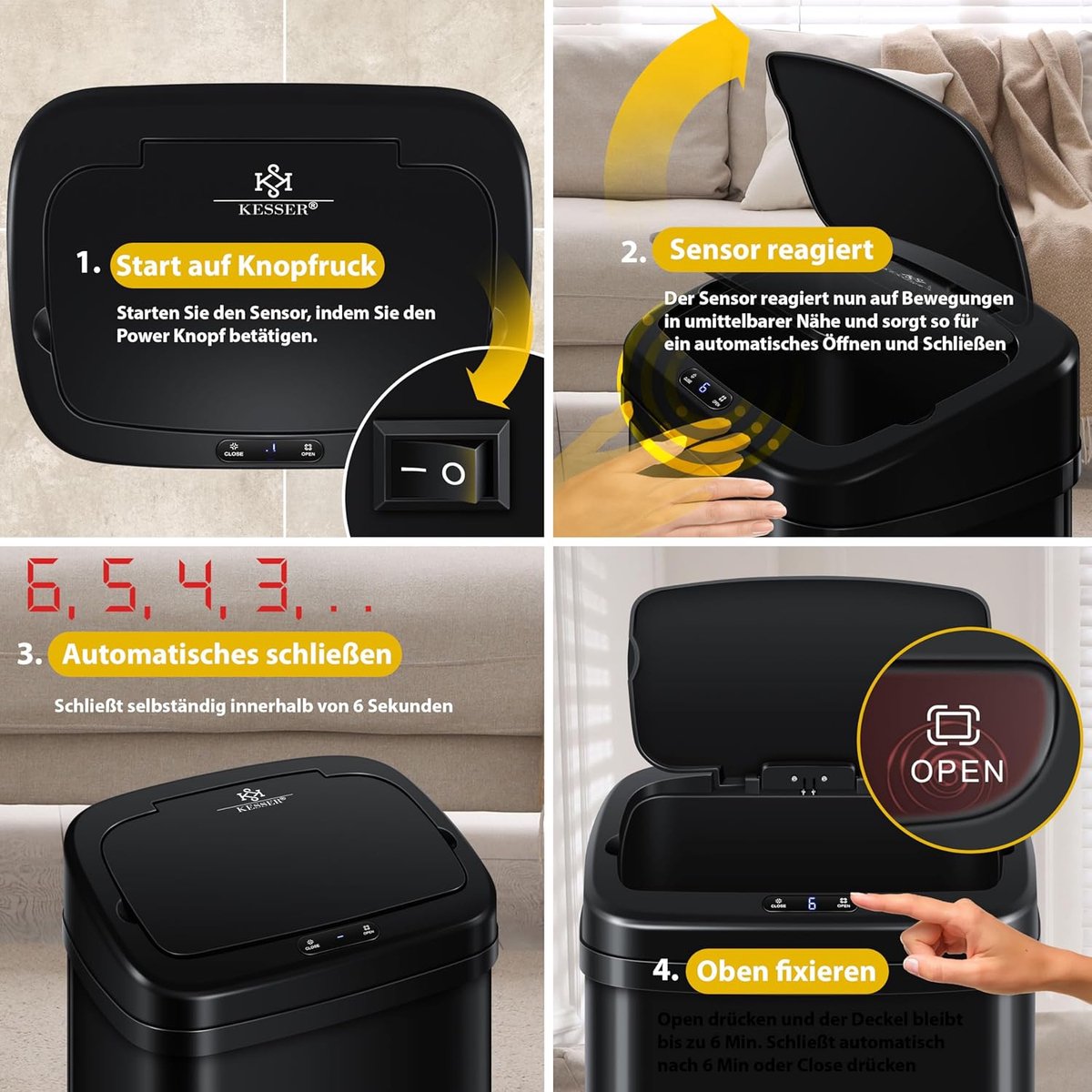 HYGIËNISCH CONCEPT EN SOFTCLOSE DEKSEL Dankzij een speciaal hygiënisch concept en de Softclose-automaat sluit de deksel na zes seconden stil en zachtjes. Deze functie zorgt niet alleen voor een kiemvrije afvalverwerking, maar zorgt ook voor een aangenaam achtergrondgeluid in het dagelijks leven. De Kesser Premium sensorafvalbak combineert innovatie, veelzijdigheid en esthetiek voor een uitstekende afvalverwerkingsoplossing.