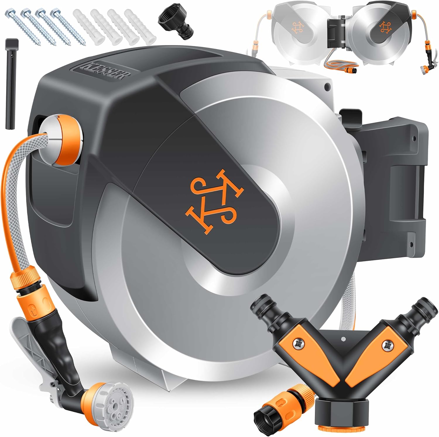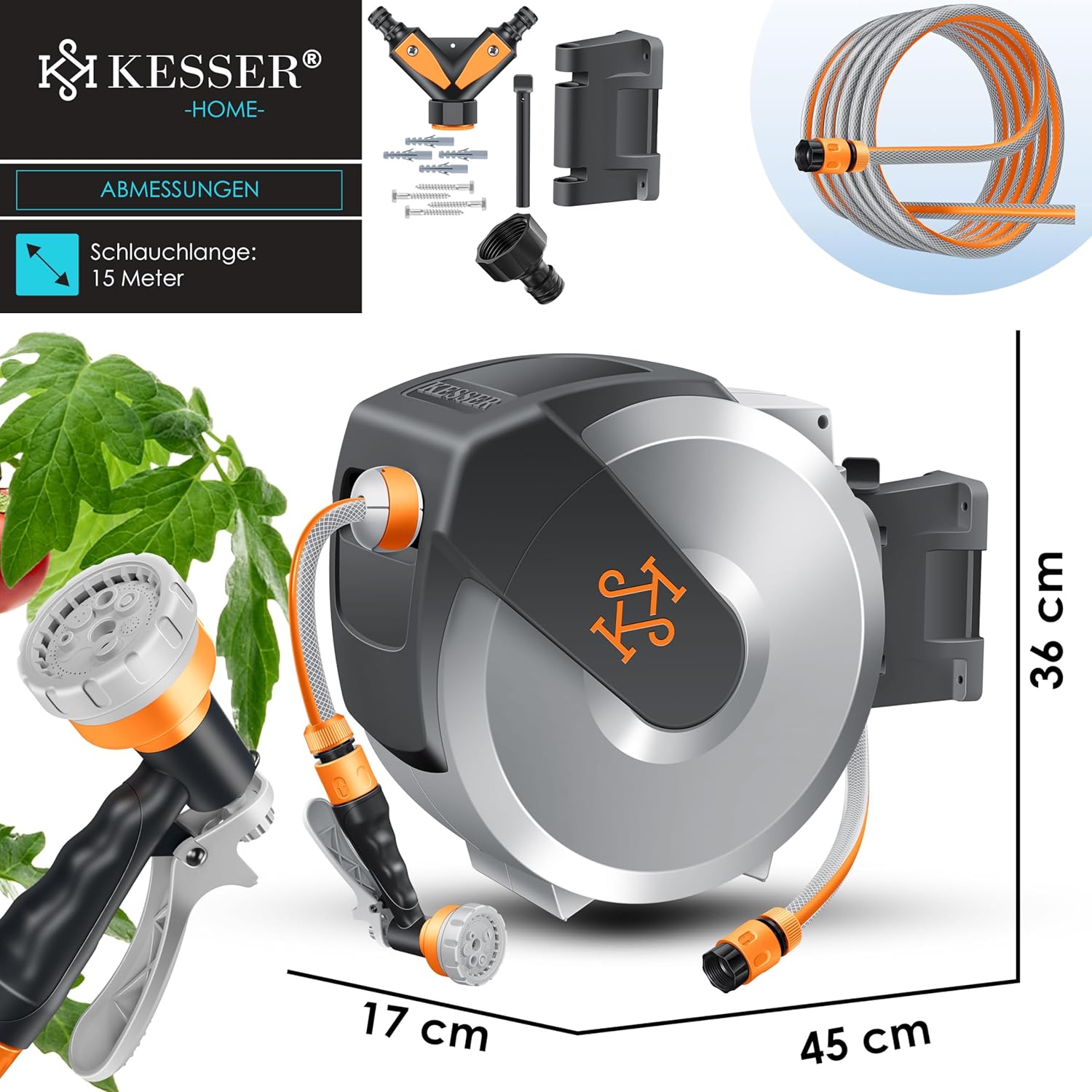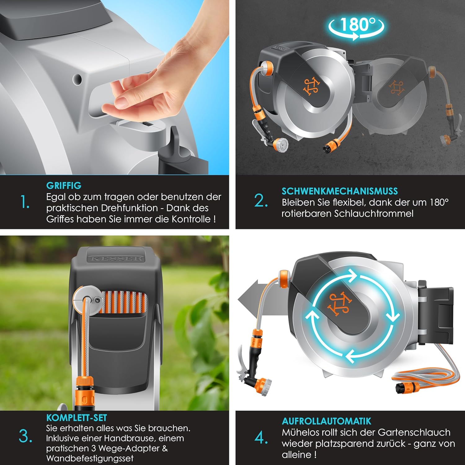 • Ergonomische oprolfunctie: de KESSER slanghaspel biedt een automatische oprolfunctie die de slang moeiteloos en ruimtebesparend intrekt. Na gebruik trekt de tuinslang zich vanzelf weer in, wat het vervelende oprollen en het risico op struikelen door rondliggende slangen elimineert. Dit zorgt voor een schone en nette tuinomgeving.