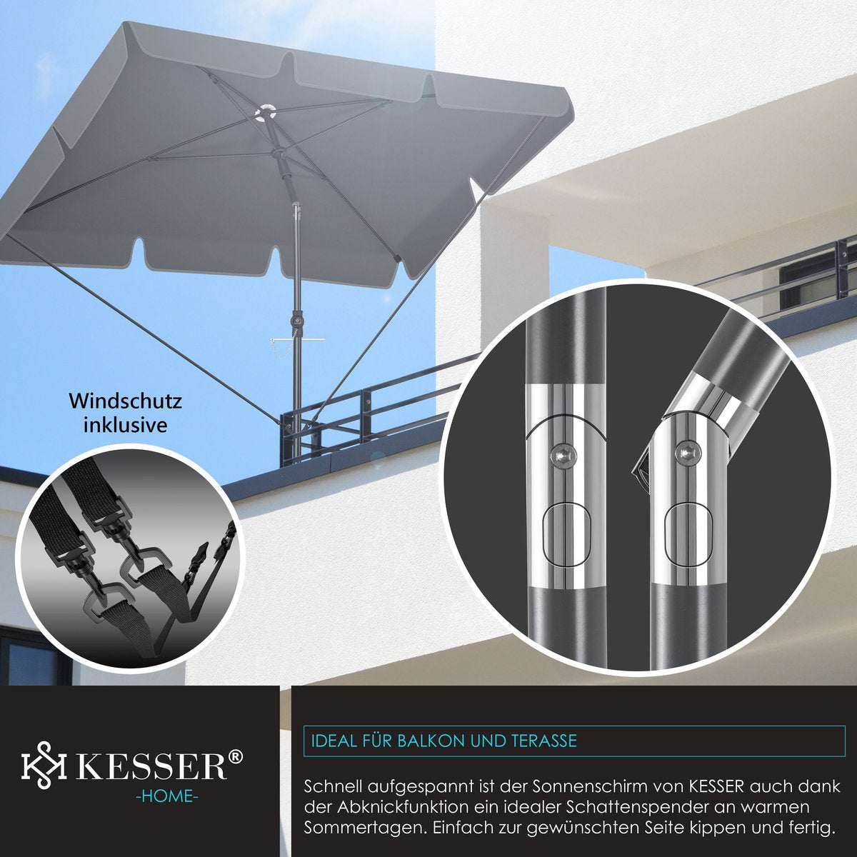 VEILIG EN ROBUUST: De stevige telescopische mast, bestaande uit twee delen lichtgewicht, roestvrij aluminium met een diameter van 28/32 mm, is eenvoudig in elkaar te zetten voor een stabiele ondersteuning. Daarnaast kan de parasol met de bijpassende KESSER parasolhouder aan uw balkonrailing worden bevestigd om bestand te zijn tegen wind en weer. Het schermdoek is gemaakt van 100% polyester met een dichtheid van 180 g/m2 en is waterafstotend, zodat u de parasol ook bij regenachtig weer kunt gebruiken.