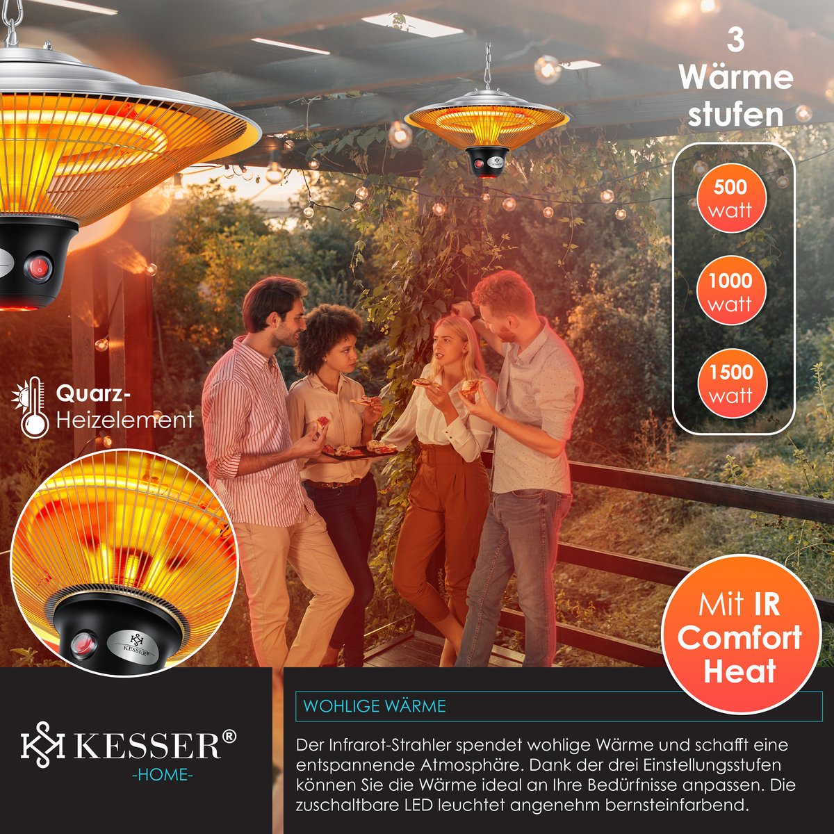 KESSER warmtestraler 1500W, 3 warmtestanden voor behaaglijke warmte, spatwaterdicht en beschermd tegen indringen van vreemde voorwerpen, robuust aluminium scherm, geurloze, rookvrije en geruisloze verwarming.