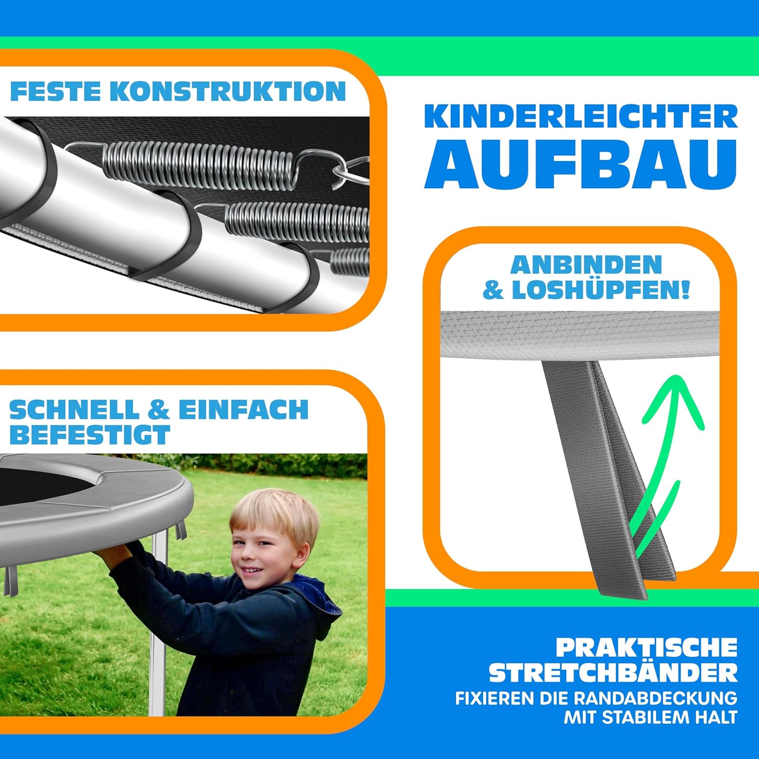 • Bevestigingsbanden: de praktische bevestigingsbanden aan de onderkant van de afdekking kunnen snel en eenvoudig aan het frame van de trampoline worden bevestigd.