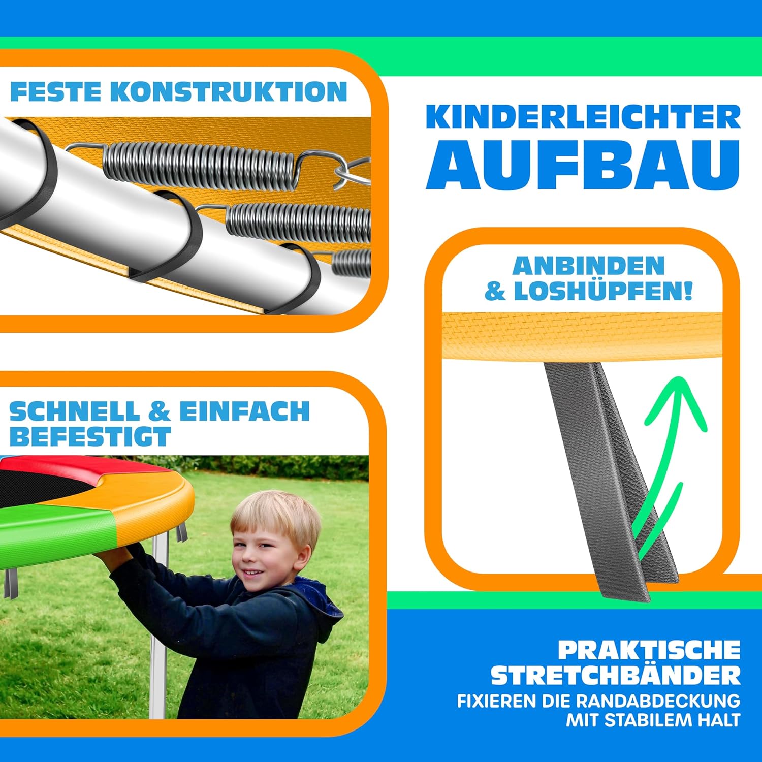 • Bevestigingsbanden: de praktische bevestigingsbanden aan de onderkant van de afdekking kunnen snel en eenvoudig aan het frame van de trampoline worden bevestigd.