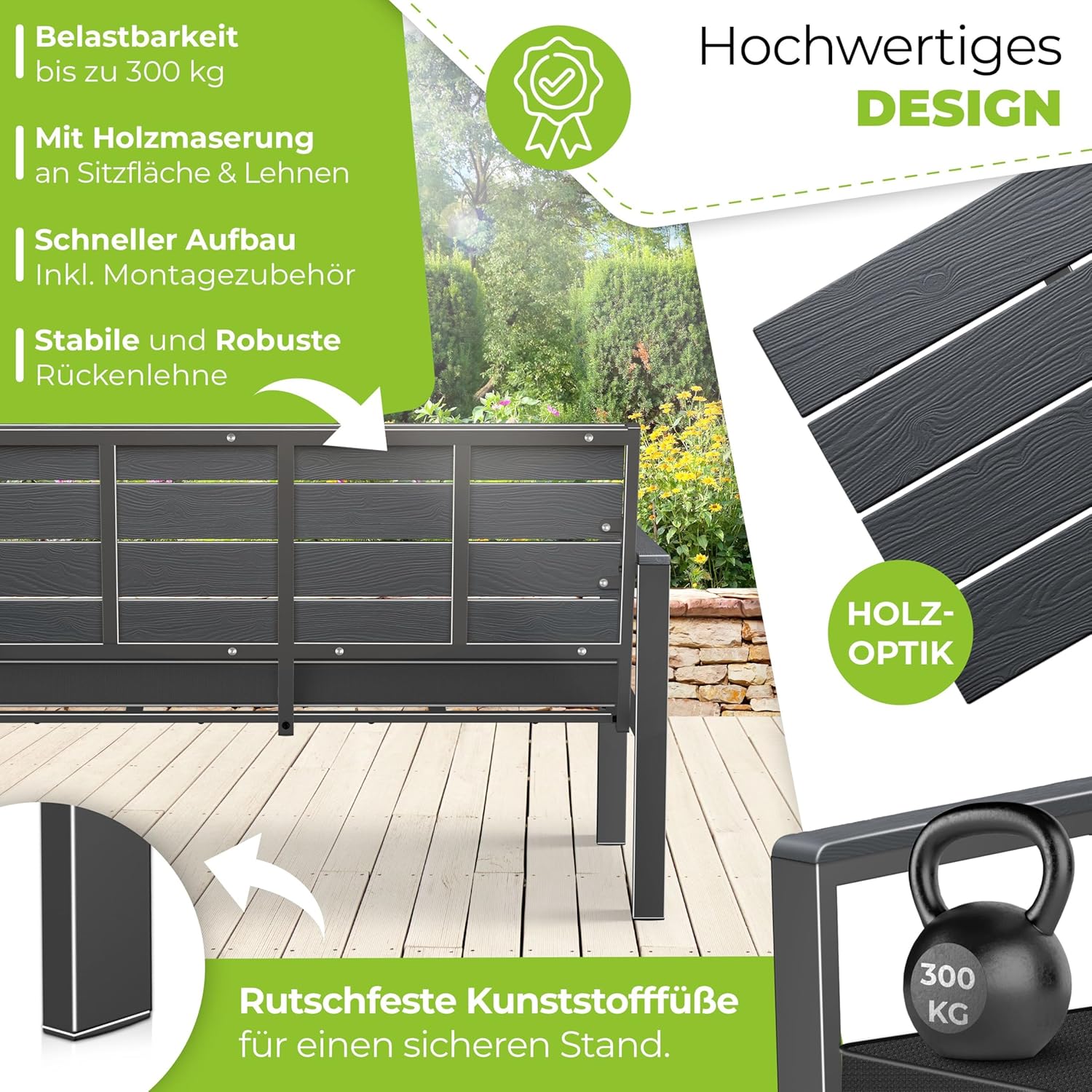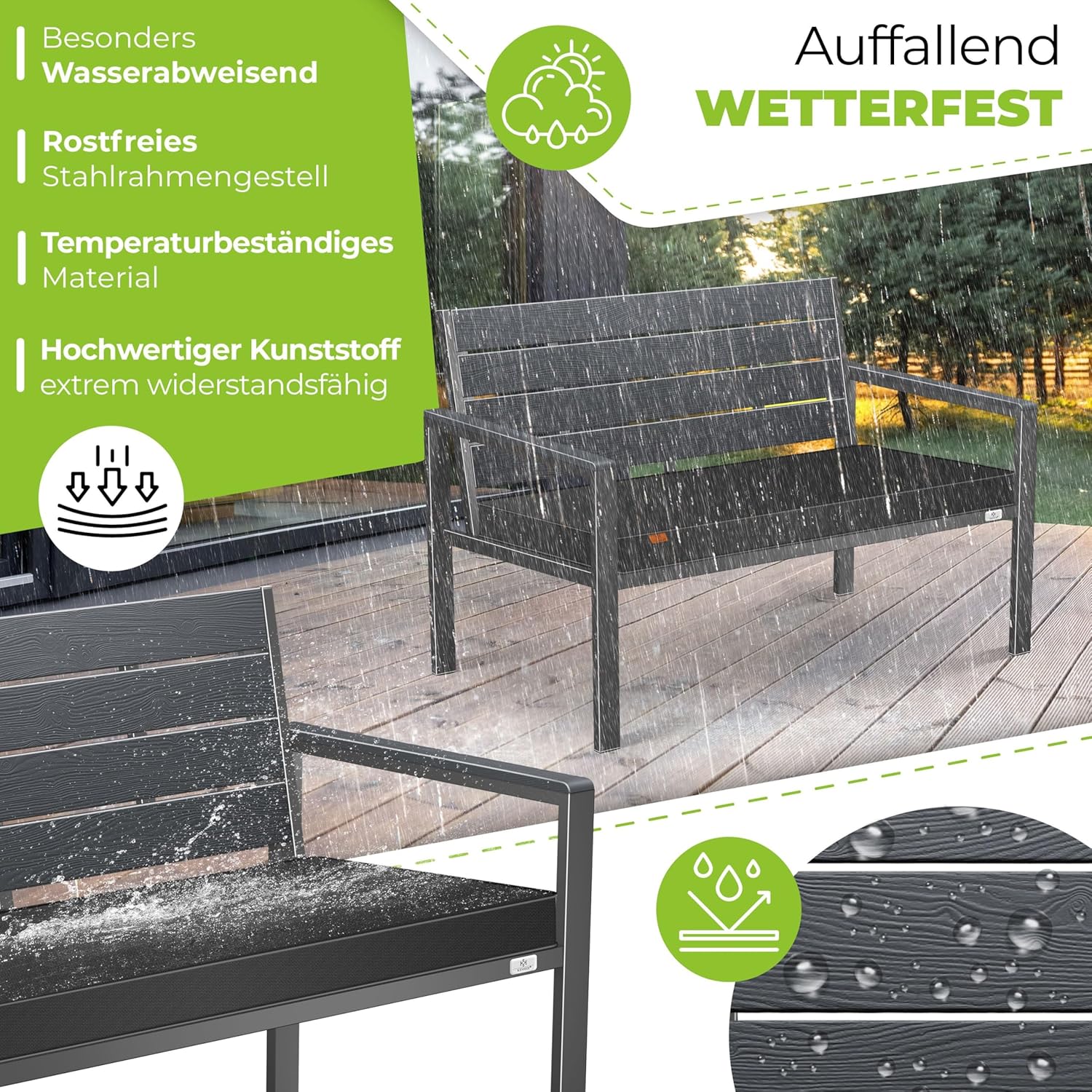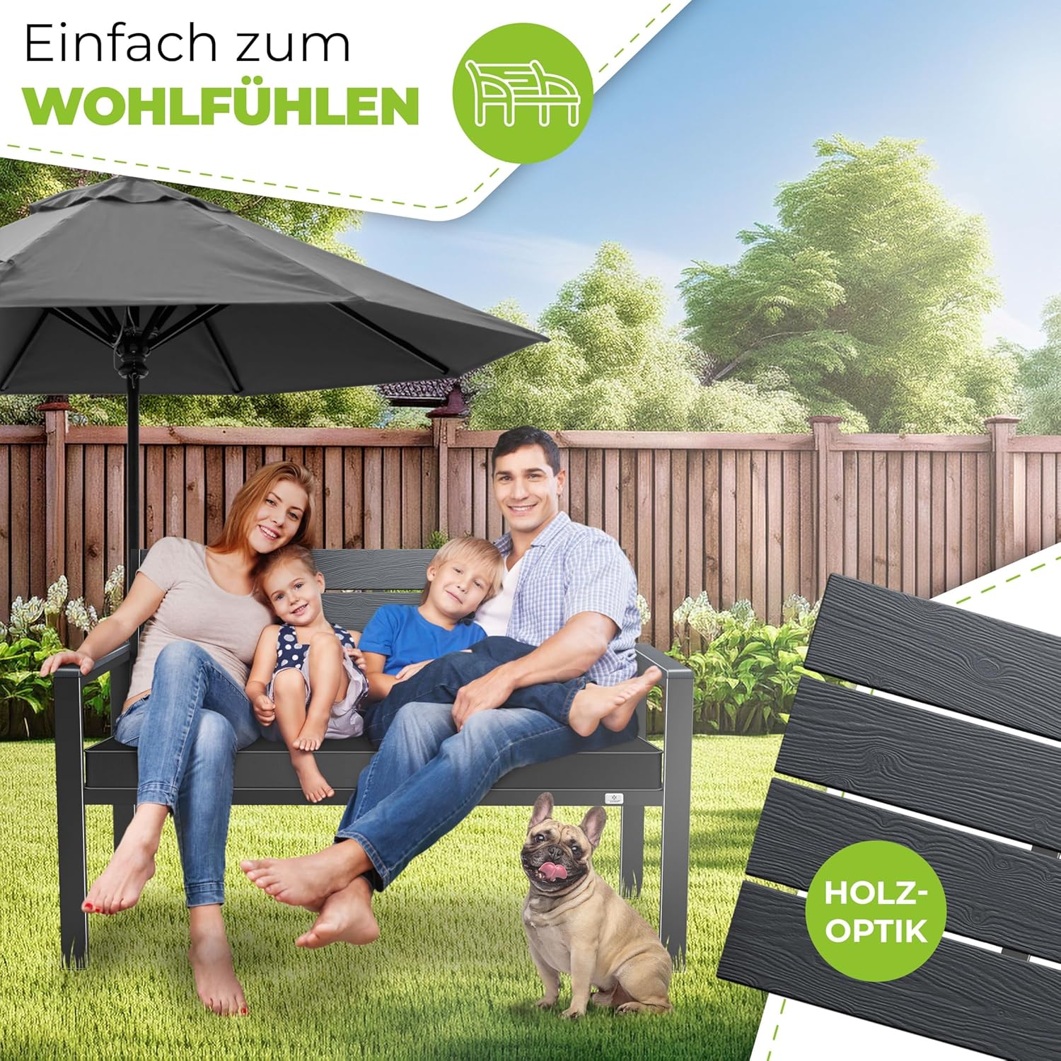 • Robuust en weerbestendig: de KESSER tuinbank is gemaakt van hoogwaardig kunststof en een roestvrij stalen frame, wat hem bijzonder goed bestand maakt tegen weersinvloeden. UV-bestendige kunststof onderdelen aan de zitting en rugleuningen zorgen ervoor dat de bank ook bij intensief zonlicht niet vervaagt en zijn stabiliteit behoudt.
