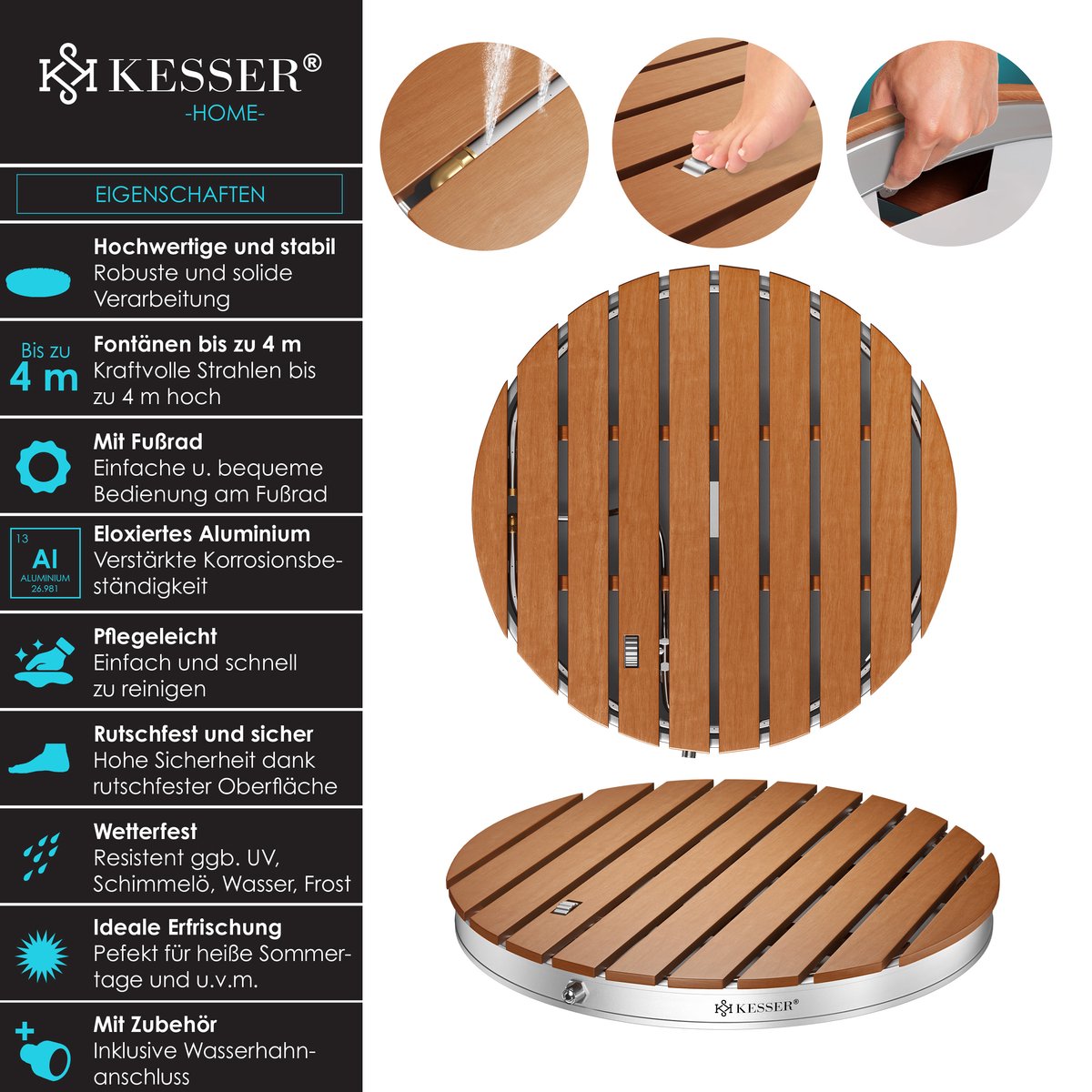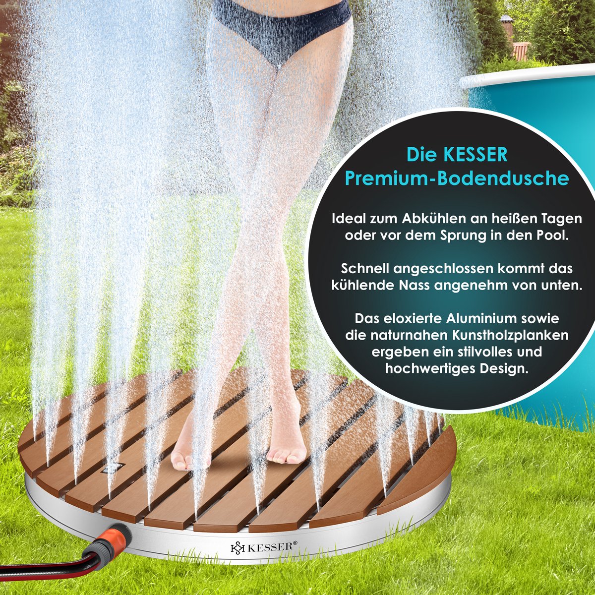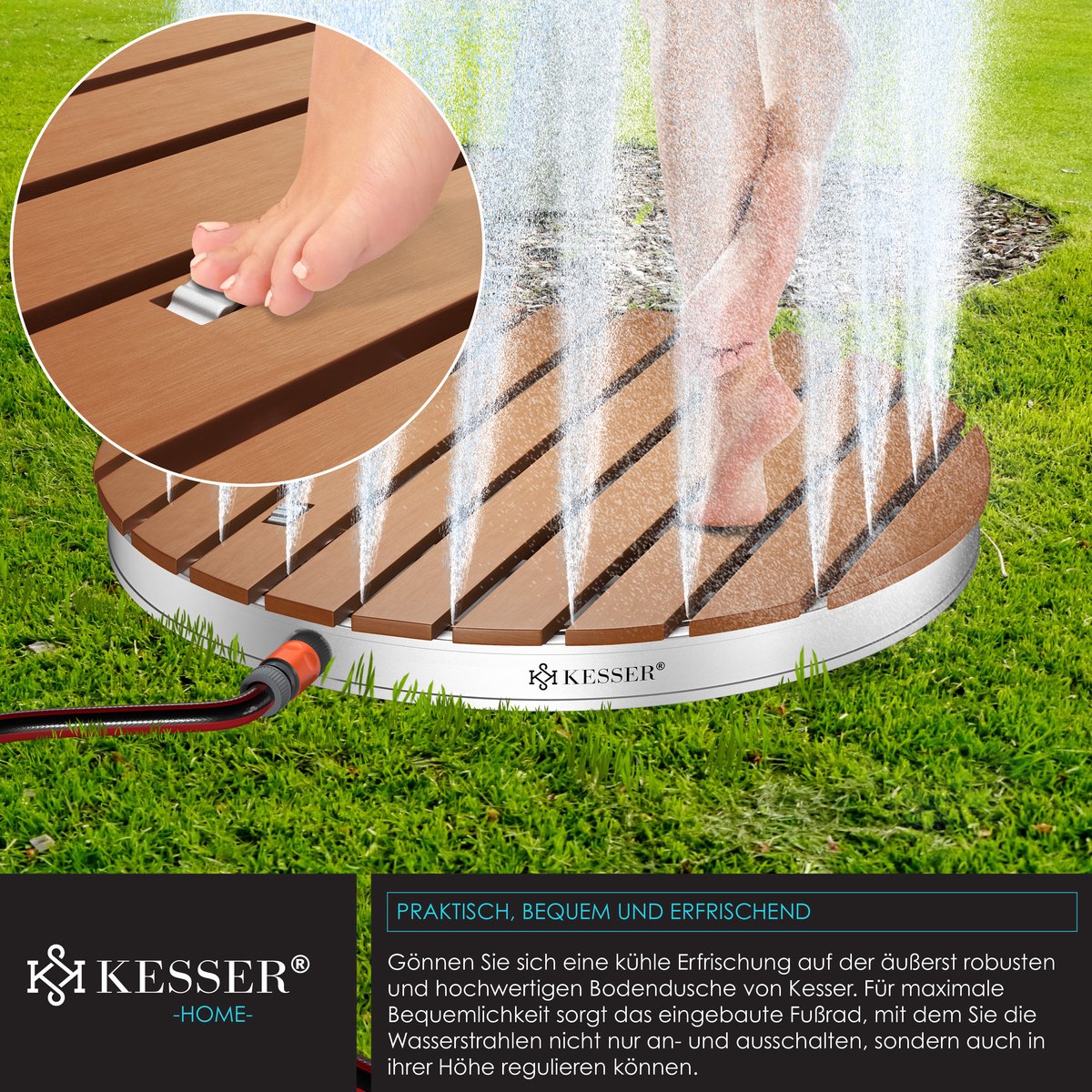 Sluit de KESSER Gronddouche eenvoudig aan op uw tuinslang en trakteer uzelf op een koele verfrissing op de uiterst robuuste gronddouche van KESSER. Voor maximaal comfort zorgt het ingebouwde voetpedaal, waarmee u de waterstralen niet alleen kunt in- en uitschakelen, maar ook in hoogte tot 4 meter kunt regelen.