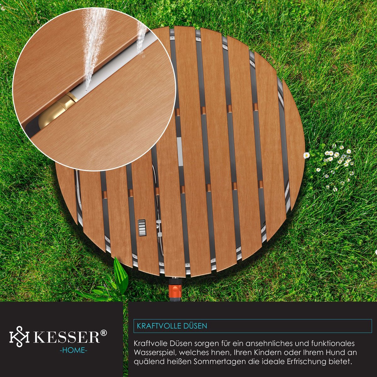 Krachtige stralen zorgen voor een fraai en functioneel waterspel, dat u, uw kinderen of uw hond op zinderend hete zomerdagen de ideale verfrissing biedt. De waterfonteinen schieten omhoog en sijpelen als zachte zomerregen weer op uw huid. Sluit uw ogen en denk aan deze verfrissing op een hete zomerdag.