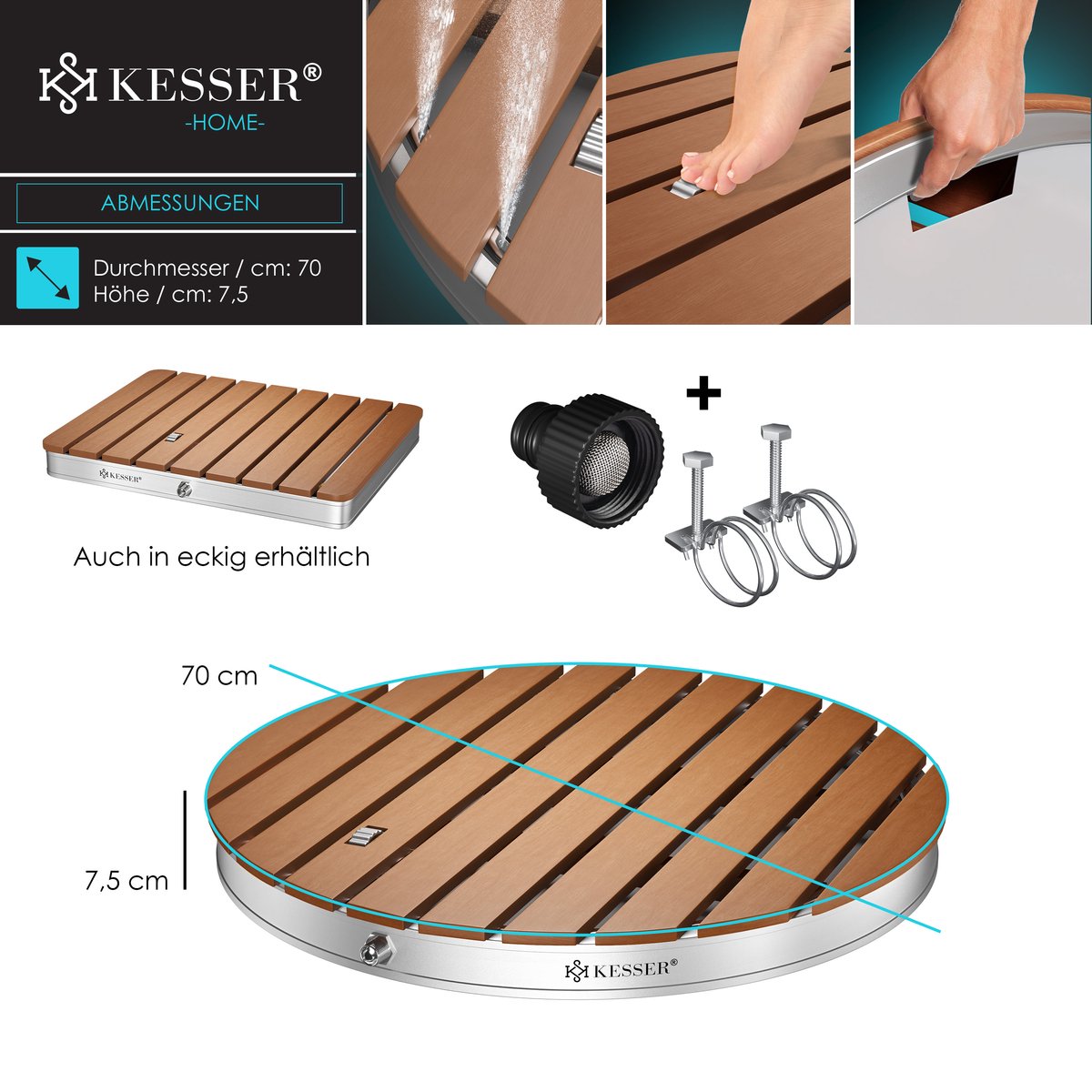 KESSER® Tuindouche Gronddouche Buitendouche Saunadouche Campingdouche 70x55 cm Rechthoek Fonteinhoogte instelbaar tot 4 m Met voetpedaal, Aluminium / WPC, antislip oppervlak Weerbestendig, Houtlook