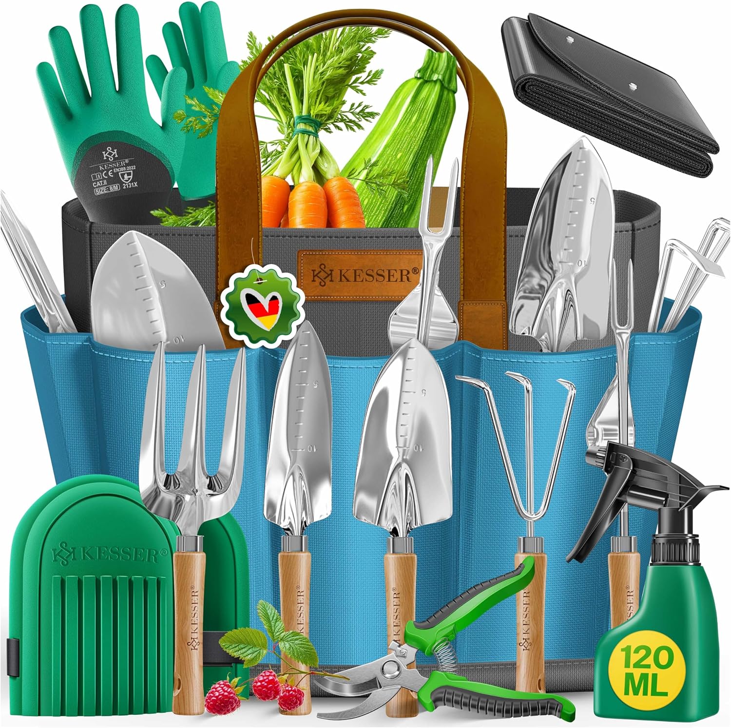 Veiligheid en comfort: de KESSER tuingereedschapsset biedt optimaal comfort door ergonomische houten handgrepen die de belasting van de handen verminderen. De kniebeschermers en de plantenmat zorgen voor extra bescherming en comfort bij het tuinieren. De robuuste tas van waterdicht 600D Oxford-materiaal houdt alle gereedschappen veilig en georganiseerd – ideaal voor tuinliefhebbers en hobbytuinders.