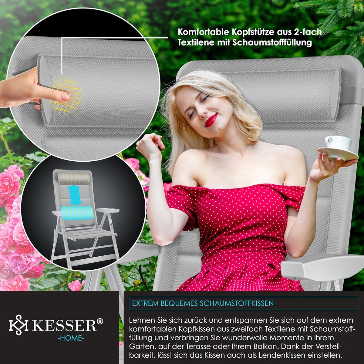 • De Kesser terrasteel: ontworpen om je outdoor-ervaring naar een nieuw niveau te tillen. De 7-voudig verstelbare rugleuning maakt het mogelijk om de perfecte positie voor maximale ontspanning te vinden, of je nu wilt zitten, liggen of achterover wilt leunen. Deze veelzijdigheid maakt hem tot de ideale metgezel voor gezellige uren in de tuin, op het terras of balkon.