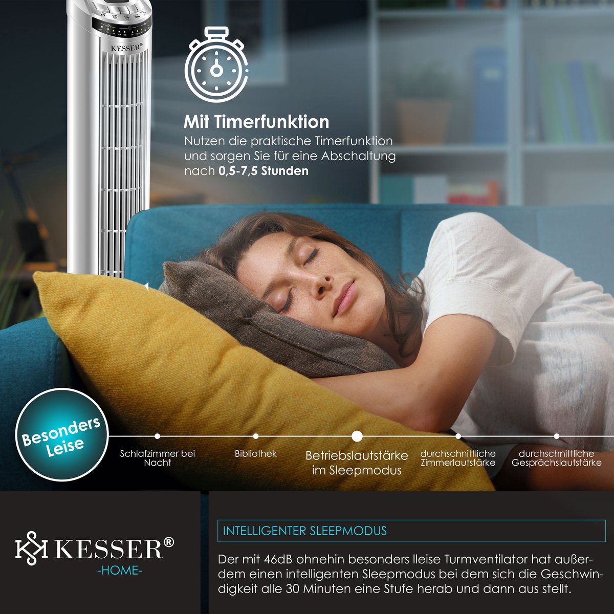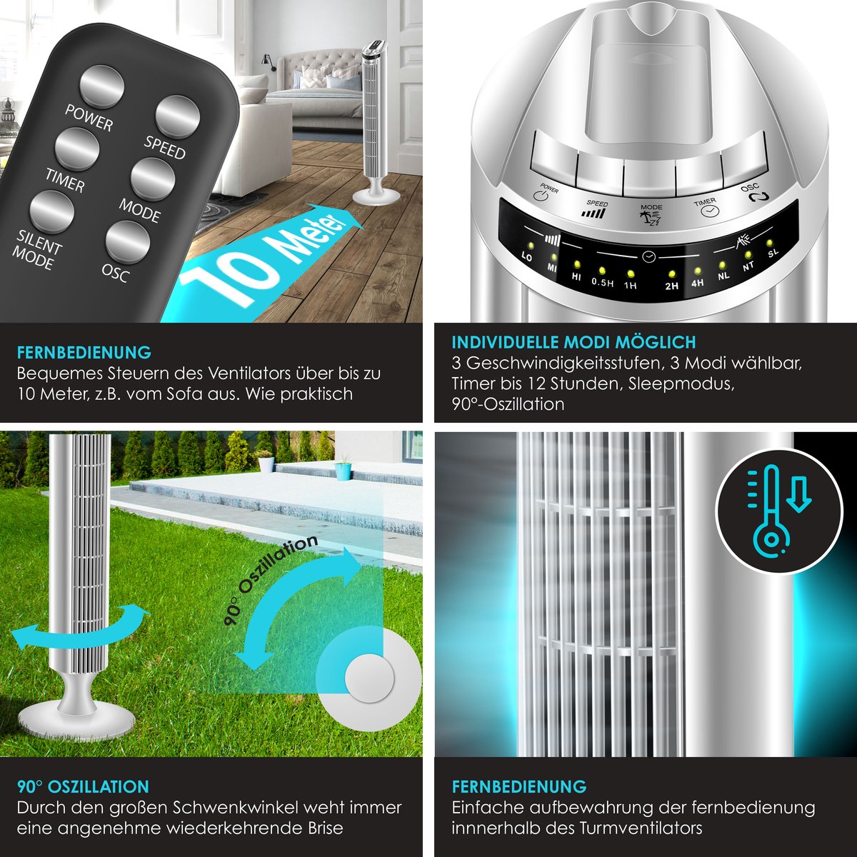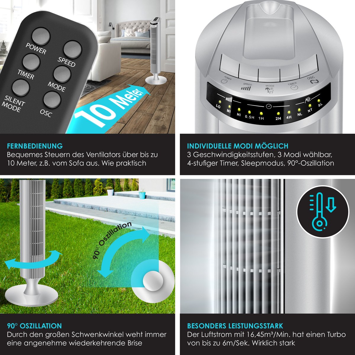 Uitstekende prestaties: Dankzij de 90 cm hoge constructie en de krachtige 45W motor verdeelt de ventilator de lucht verticaal over een groot oppervlak. Dankzij de 90°-oscillatie zorgt hij ook horizontaal voor een aangename frisheid. Bovendien draait de ventilator in een hoek van 90° heen en weer, waardoor koele frisheid in de kamer komt.