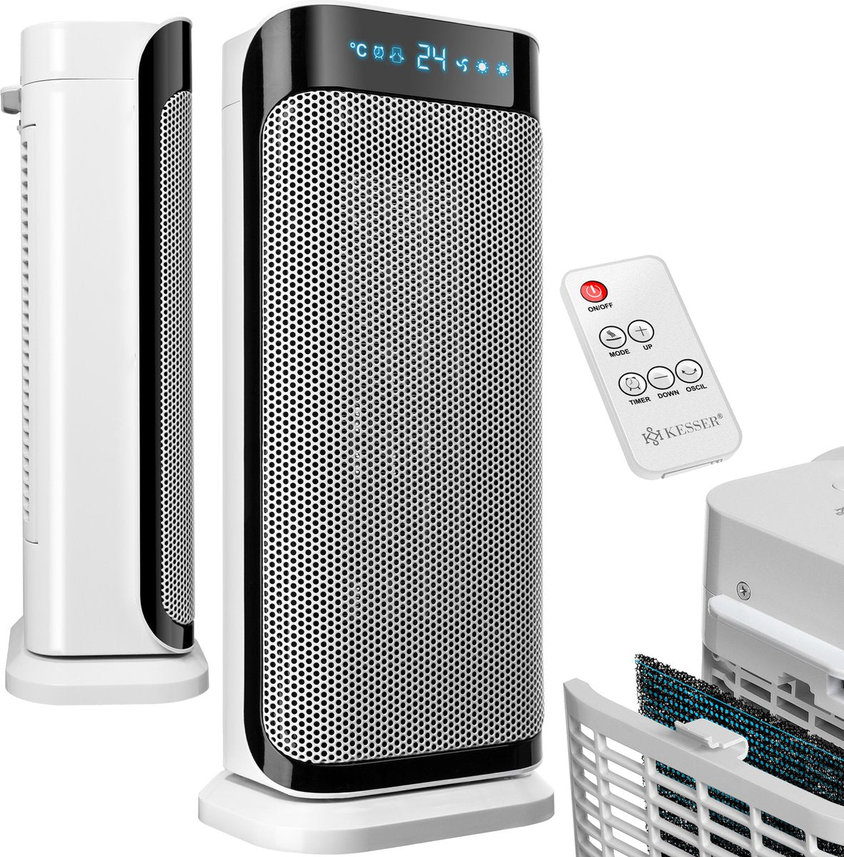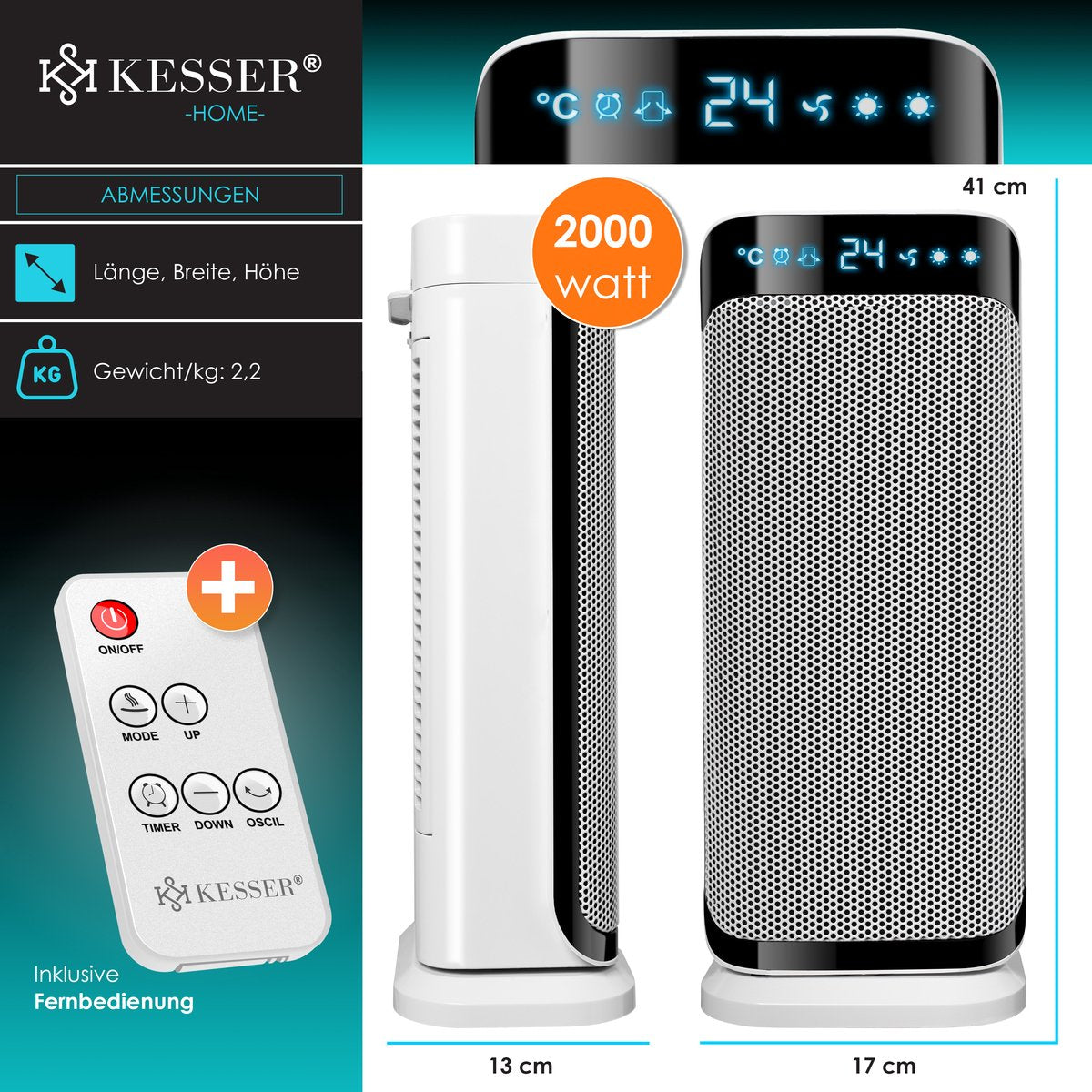 KESSER krachtige keramische luchtverhitter 2000W met modern LED-display, individueel instelbare temperatuur voor gelijkmatige warmteverdeling in grote en kleine ruimtes, incl. afstandsbediening.