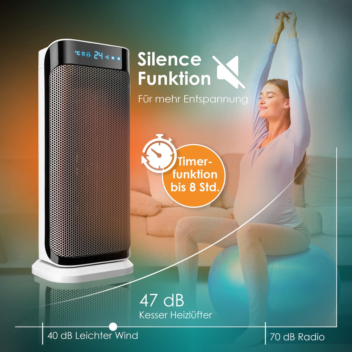 AANPASBARE TIMER: Met de extra tijdfunctie kun je de ventilatorkachel individueel instellen tussen 0 en 8 uur.