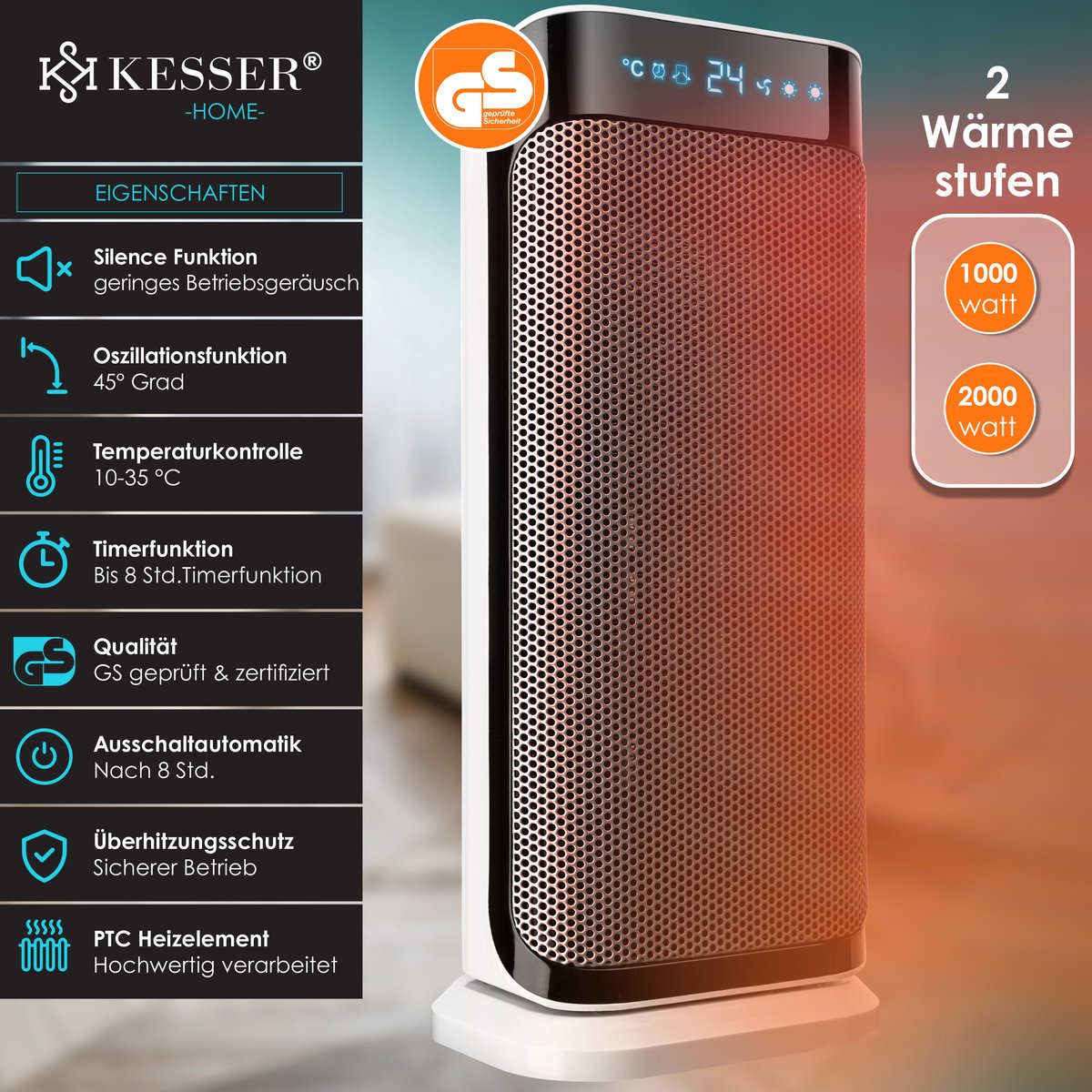 GEBRUIK: Naast al deze voordelen biedt de keramische luchtverhitter natuurlijk ook overtuigende prestaties 2000W Met de snelle luchtverhitter van KESSER kunt u snel, veilig en energiezuinig verwarmen met een laag stroomverbruik. Dit apparaat komt alleen tot zijn recht in goed geïsoleerde ruimtes.
