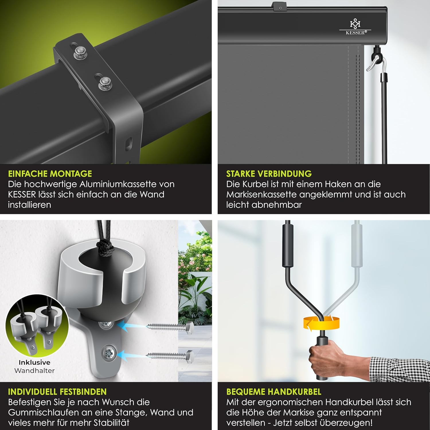 • Zicht- en zonbescherming: onze KESSER verticale luifel biedt de ideale bescherming voor warme zomerdagen op balkon, terras, tuin, serre of ramen tegen direct zonlicht. De inkijkbescherming beschermt je tegen de nieuwsgierige blikken van je buren, ontbijt in alle rust op je terras en geniet gewoon van je privacy.